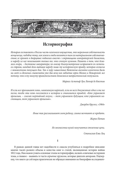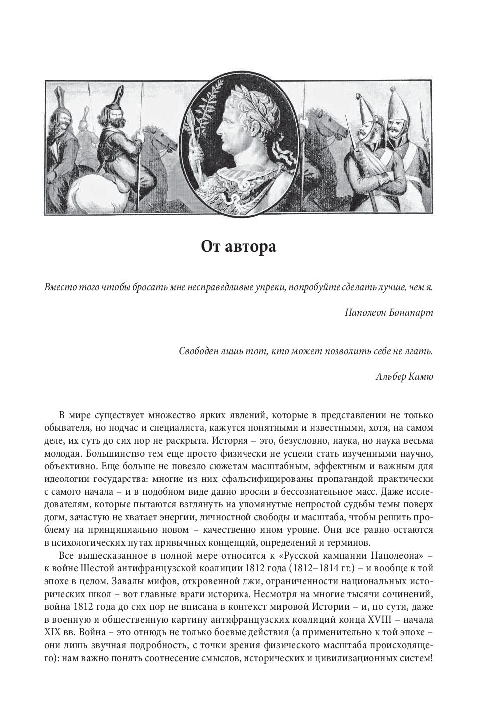 Вы узнаете об истинных планах и поступках Наполеона и Александра I, о произошедшей параллельно с вторжением гражданской войне в России, о закулисных «боях» и интригах мира профессиональных ученых и государственной пропаганды. Выпускник исторического факультета МГУ, автор многих научных работ, Евгений Понасенков, сегодня по праву считается интеллектуальным гуру нового поколения. К его заслугам относится и создание крупнейшей в России личной коллекции книг и предметов искусства эпохи Наполеона. Третье издание снабжено новой главой и дополнительными иллюстрациями.