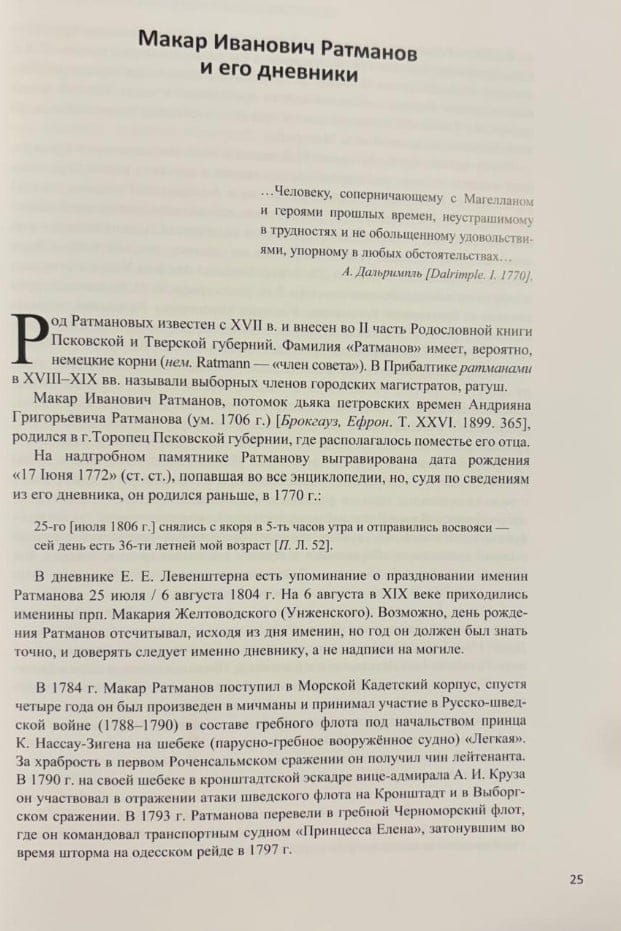 Дневники Ратманова детально освещают все этапы кругосветного плавания, помогают пролить свет на отношения между участниками экспедиции, позволяют под новым углом посмотреть на конфликт между капитаном И.Ф.Крузенштерном и послом Н.П.Резановым.