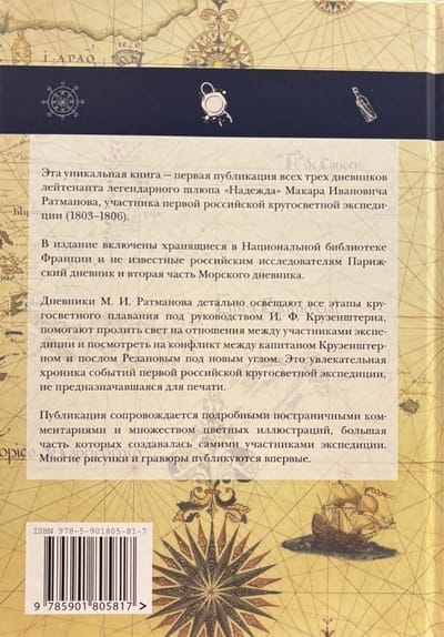 В книге впервые в полном объеме представлены дневники первого лейтенанта «Надежды» Макара Ивановича Ратманова (включены хранящиеся в Национальной библиотеке Франции и не известные российским исследователям Парижский дневник и вторая часть Морского). Публикация сопровождается подробными постраничными комментариями.