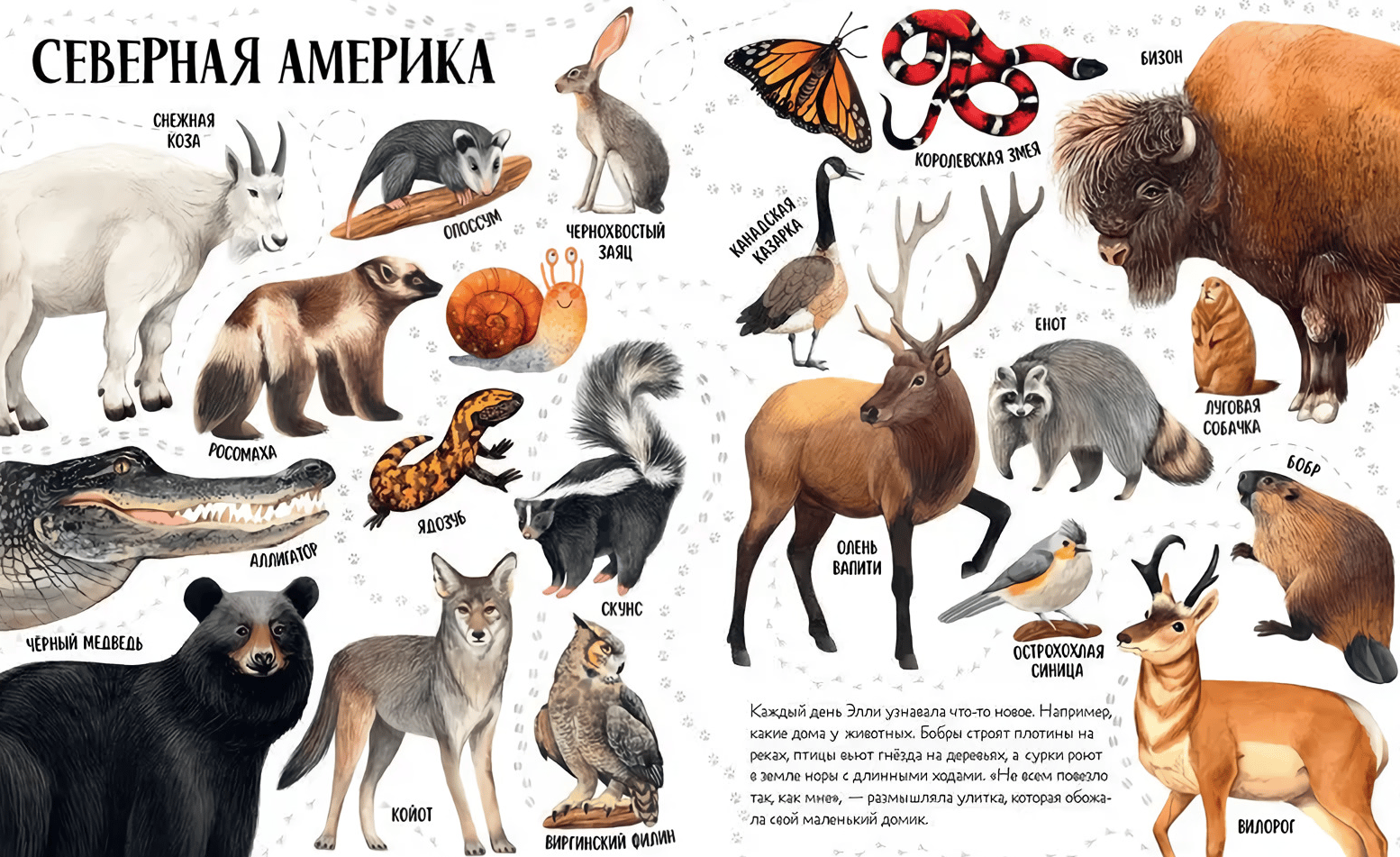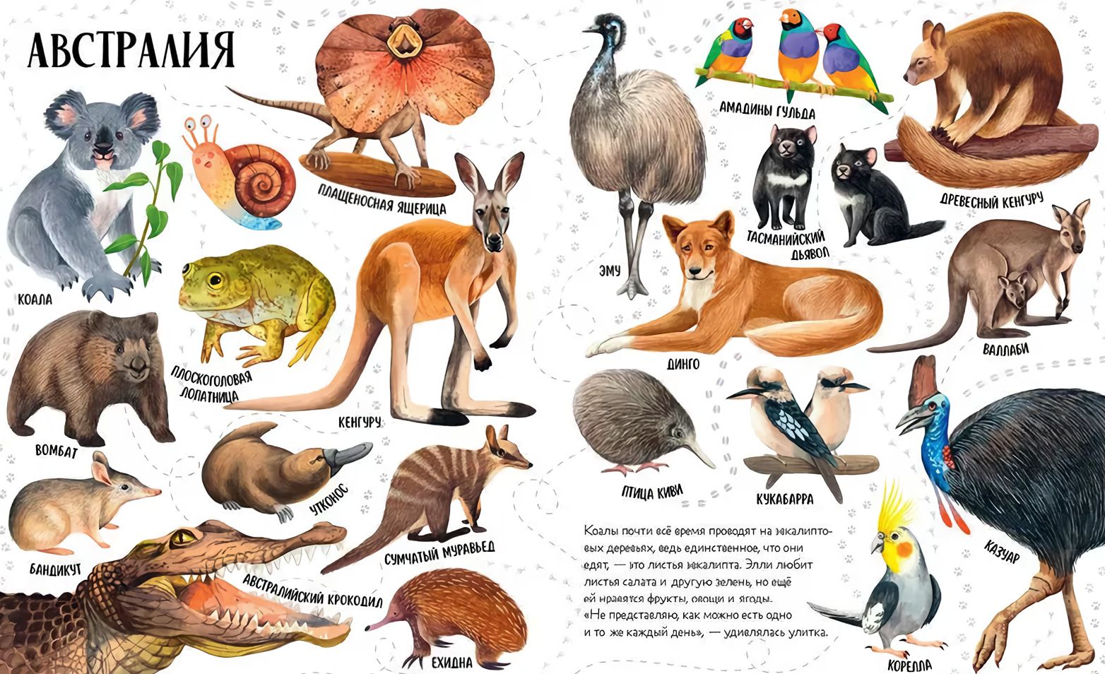 Каждый разворот книги покажет ребенку невероятно красиво нарисованных зверей: европейских — барсука, крота, ежа, лося, азиатских — верблюда, сайгака, ирбиса. А еще аллигатора и скунса из Северной Америки, пуму, капибару и тукана из Южной Америки, коалу и вомбата из Австралии. Жаркая Африка, холодная Антарктика, хищники и травоядные, птицы, жители морей и океанов…
