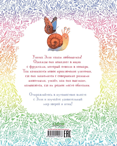 Малыши просто обожают разглядывать картинки, а в книге «Приключения улитки Элли в мире животных» есть не только яркие иллюстрации животных, но и милая история улитки, которая жила неподалеку от фермы и знала всех зверей вокруг. Однажды Элли заползла в ящик с фруктами и «приехала» в зоопарк, где познакомилась со всеми животными мира.