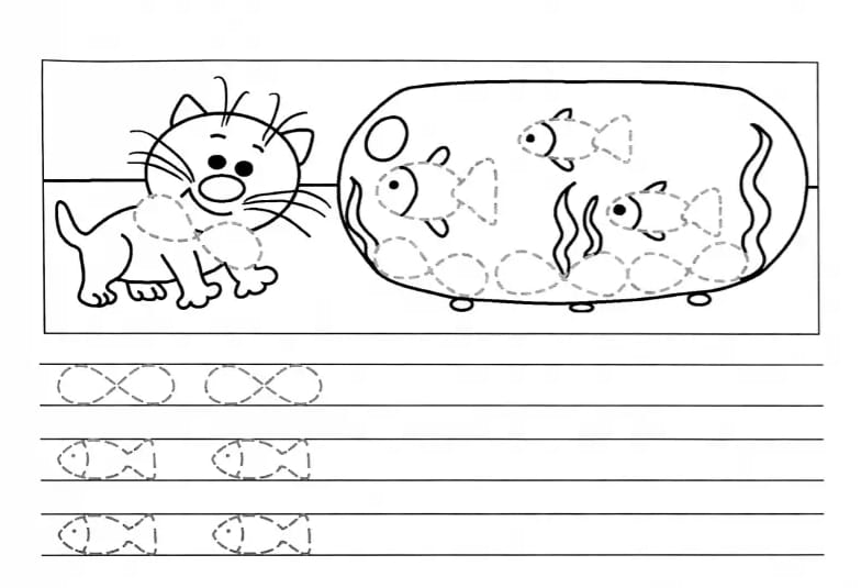 На каждой странице - картинка с пунктирными линиями, под картинкой пунктирные узоры, картинки, элементы букв, которые ребенок должен обвести и продолжить строчку.