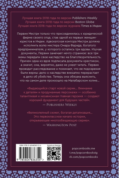 Первин Мистри только что присоединилась к юридической фирме своего отца, став одной из первых женщин-юристов в Индии. Адвокатская контора Мистри должна исполнить волю мистера Омара Фарида, богатого предпринимателя, у которого остались три вдовы. Изучая документы, Первин замечает нечто странное: все три жены передали свое наследство на благотворительность. Причем одна из вдов подписала документы крестиком, а значит, она, вероятно, даже не умеет читать. Первин проводит расследование и понимает, что ее подозрения были верны: дело о наследстве внезапно перерастает в дело об убийстве. Теперь она обязана выяснить, что на самом деле произошло на Малабарском холме…