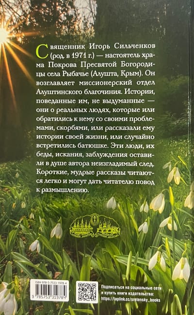 Священник Игорь Сильченков (род. в 1971 г.) — настоятель храма Покрова Пресвятой Богородицы села Рыбачье (Алушта, Крым). Он возглавляет миссионерский отдел Алуштинского благочиния. Истории, поведанные им, не выдуманные — они о реальных людях, которые или обратились к нему со своими проблемами, скорбями, или рассказали ему истории своей жизни, или случайно встретились батюшке. Эти люди, их беды, искания, заблуждения оставили в душе автора неизгладимый след. Короткие, мудрые рассказы читаются легко и могут дать читателю повод к размышлению.