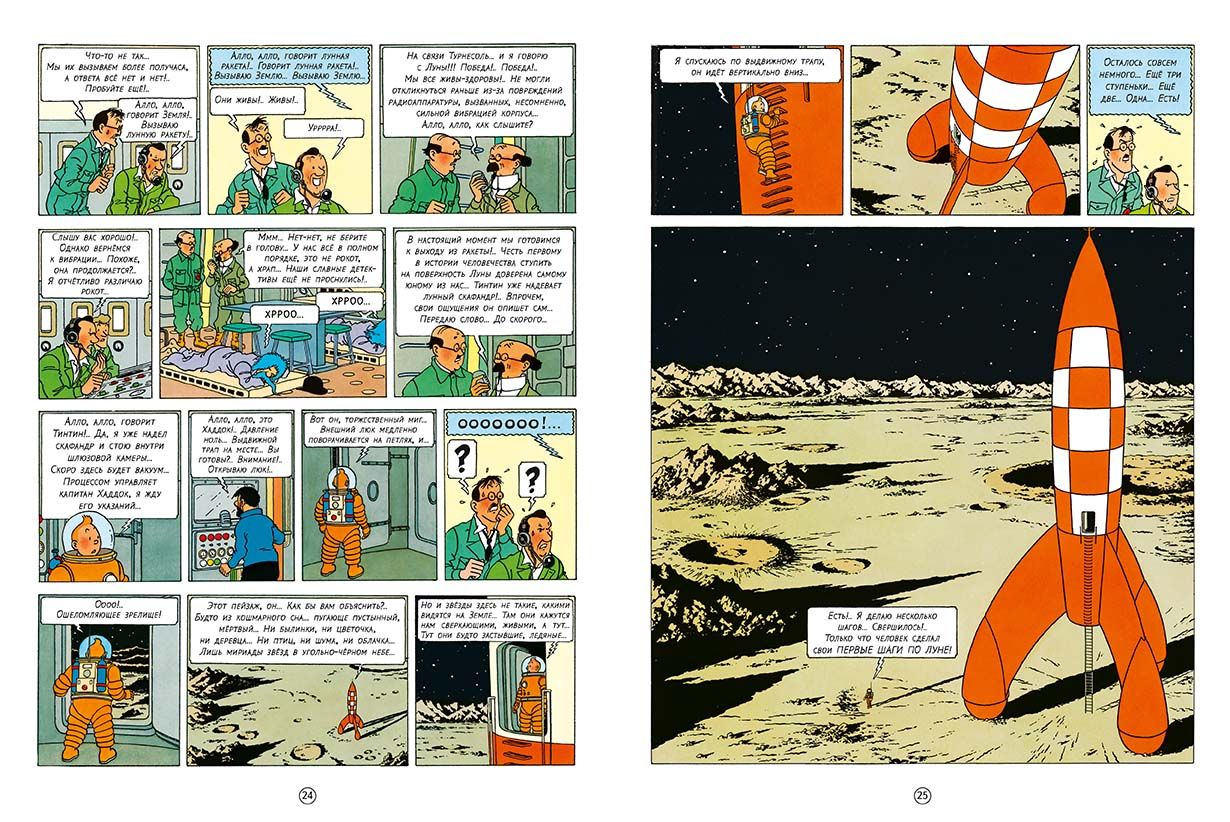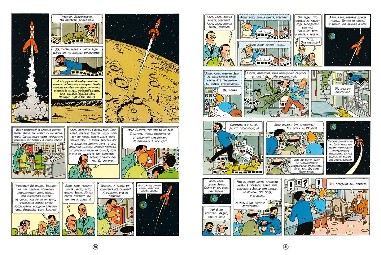 В Центре атомных исследований в сильдавском Сброе состоялся запуск лунной ракеты, на борту которой находятся Тинтин с Милу, капитан Хаддок, профессор Турнесоль и инженер Вольф. С тревогой в ЦУПе ждут, когда первые покорители космоса очнутся после стартовых перегрузок, однако все попытки выйти с ними на связь ни к чему не приводят: ответного сигнала все нет. А где-то далеко в позывные Земли вслушиваются неизвестные: для них лунная миссия представляет не только научный интерес... Так начинается вторая часть лунного триллера, который до последних страниц держит читателя в напряжении. Из трюма вылезают детективы Дюпонт и Дюпонд, очутившиеся на борту по нелепой случайности; инженер Вольф оказывается не тем, за кого себя выдавал. И непрерывная череда других событий ставит под вопрос саму возможность благополучного возвращения героев на Землю.