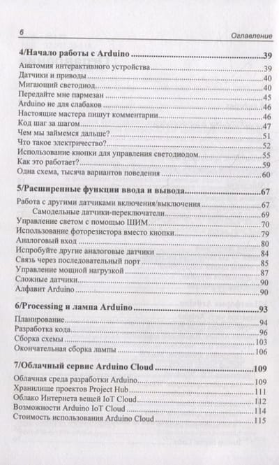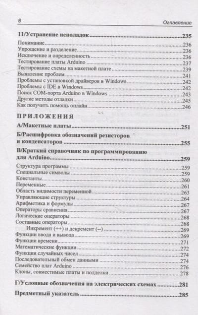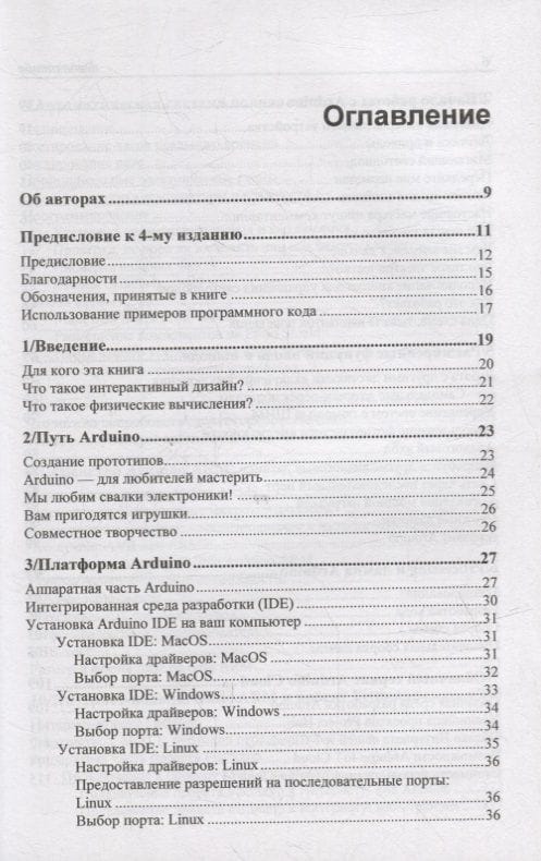 Книга представляет собой введение в мир Arduino — самой популярной платформы для прототипирования электроники с открытым исходным кодом. В ней есть как простые проекты, так и вся необходимая информация для создания собственных конструкций, от списков компонентов до финишной отладки. Рассмотрены основные принципы интерактивного дизайна и физических вычислений, современные платы Arduino и программные среды, основы электроники, прототипирование на макетной плате, создание принципиальных схем, облачные платформы. Подробно описан ряд практических проектов, в том числе автоматическая система полива растений и проекты с выходом в Интернет через Wi-Fi. Материал изложен с учетом последней версии Arduino IDE и новых плат на базе ARM.