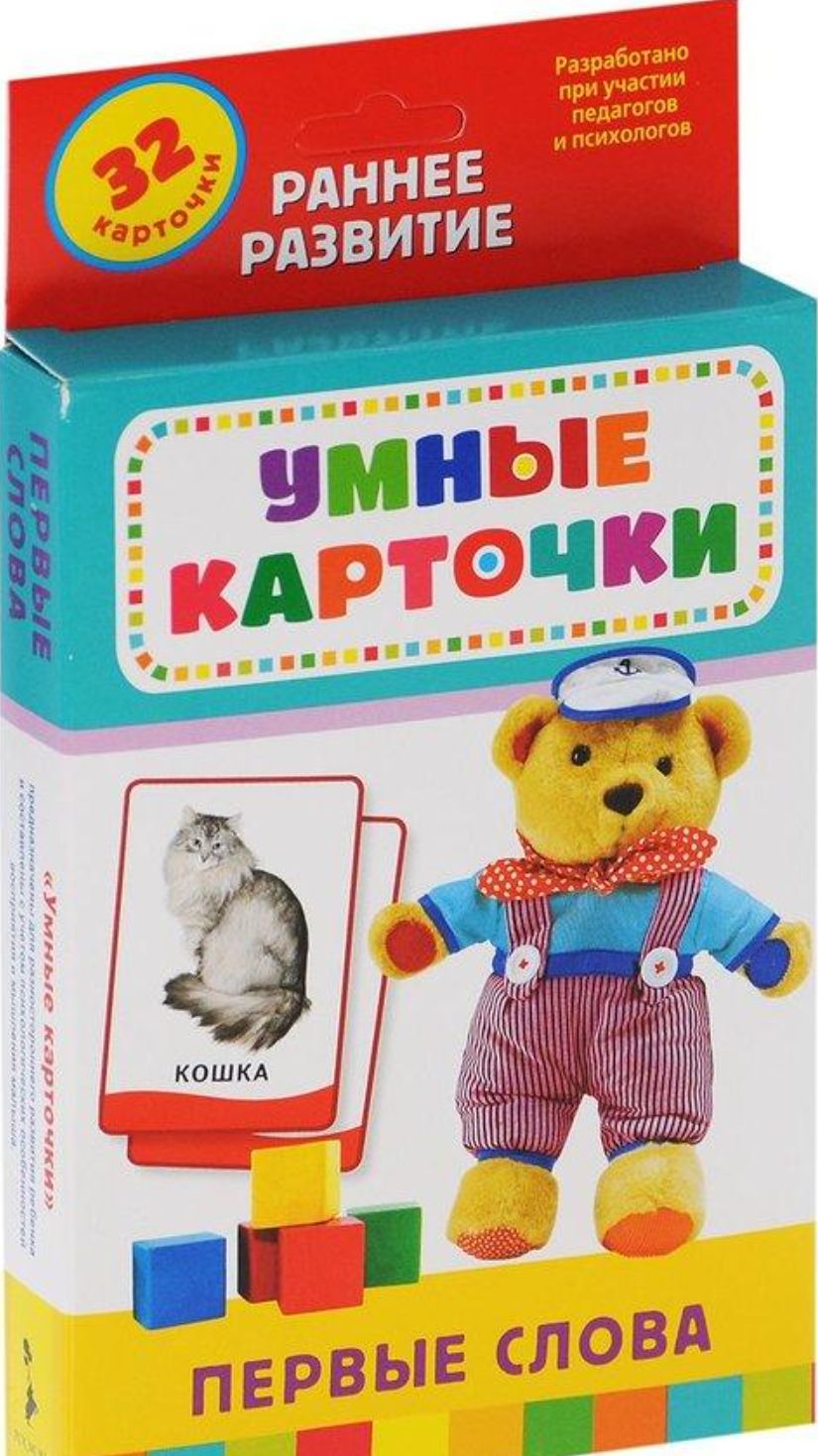 Заниматься с набором «Умные карточки» легко и очень интересно! Красивые большие фотоиллюстрации, увлекательные задания и вопросы - все это направленно на разностороннее развитие крохи. Набор «Первые слова» состоит из 32 больших карточек размером 10,7 x 15,7 см. На одной стороне карточки - крупное изображение предмета по теме, на обратной - несколько вопросов и заданий, которые помогут родителям интересно провести занятие с малышом. Карточки содержат задания разного уровня сложности. Помимо предложенных в наборе занятий вы можете дать волю фантазии и придумать свои задания и игры с карточками. Таким образом, с одним набором можно заниматься неоднократно, каждый раз находя новые темы для обсуждения и усложняя задания.