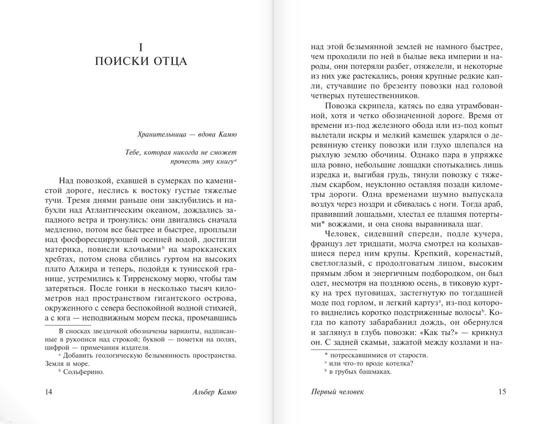 4 января 1960 года Альбер Камю погиб в автокатастрофе. Среди обломков автомобиля была найдена его дорожная сумка и в ней – черновая версия романа «Первый человек». Через тридцать четыре года после смерти автора книга, подготовленная дочерью писателя Катрин Камю, увидела свет.