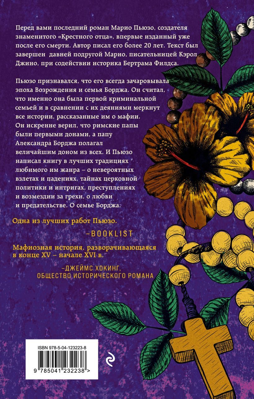 Перед вами последний роман Марио Пьюзо, создателя знаменитого «Крестного отца», впервые изданный уже после его смерти. Автор писал его более 20 лет. Текст был завершен давней подругой Марио, писательницей Кэрол Джино при содействии историка Бертрама Филдса. Пьюзо признавался, что его всегда зачаровывала эпоха Возрождения и семья Борджа. Он считал, что именно она была первой криминальной семьей, и в сравнении с их деяниями меркнут все истории, рассказанные им о мафии. Он искренне верил, что римские папы были первыми донами, а папу Александра Борджа полагал величайшим доном из всех. И Пьюзо написал книгу в лучших традициях любимого им жанра – о невероятных взлетах и падениях, тайнах церковной политики и интригах, преступлениях и возмездии за грехи, о любви и предательстве. О семье Борджа.