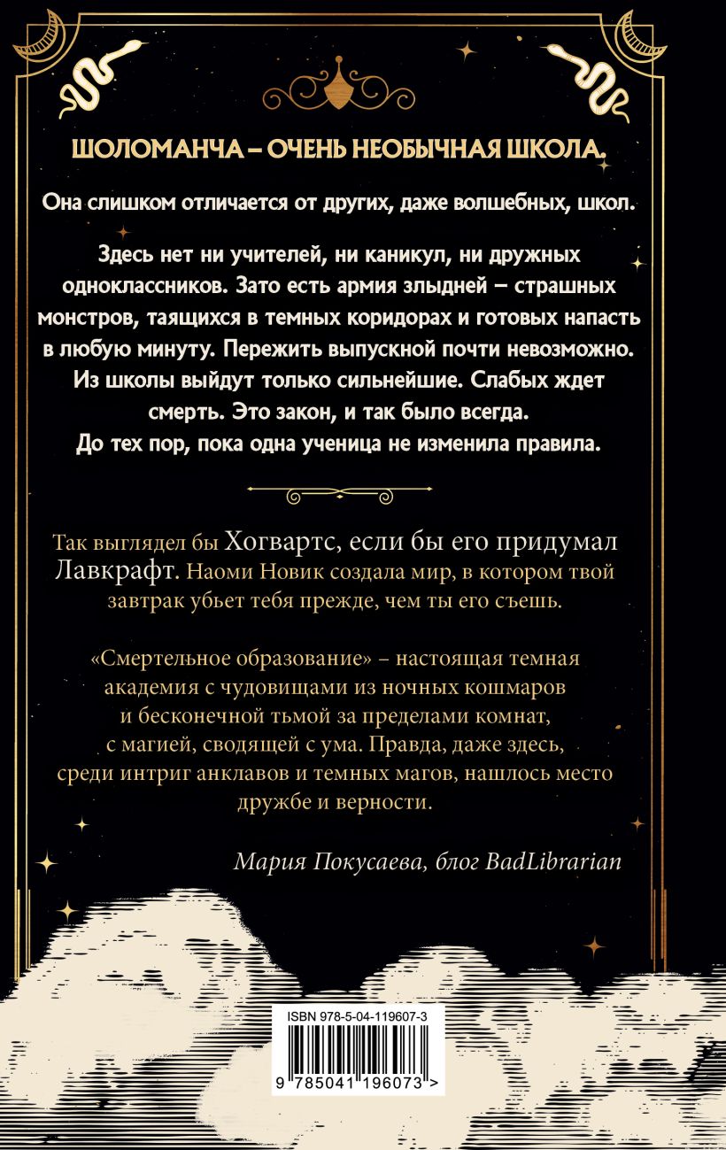 Не все волшебные школы одинаковы. Эта захочет тебя убить. Галадриэль знает закон: только сильнейшие маги смогут выбраться из стен Шоломанчи. Здесь нет ни учителей, ни каникул, ни друзей. Зато в тёмных коридорах всегда полно злыдней – опасных существ, готовых наброситься на тебя в любой момент. Пережить выпускной – вот главная цель каждого, кто однажды попал сюда. Но, кажется, на этот раз школа приготовила испытание, которое невозможно пройти. С чем это связано? Кто в этом виноват? И как спасти себя и всех остальных?