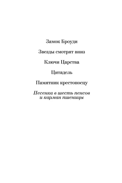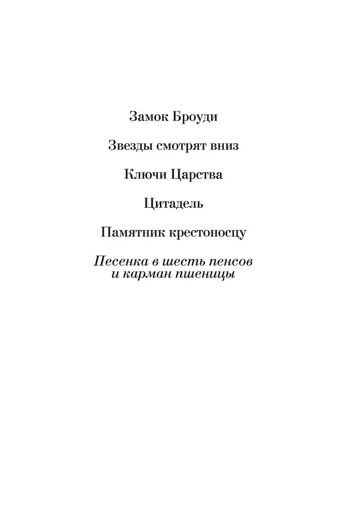 Читатель встретит здесь тот же яркий повествовательный дар, которым отмечены и другие романы автора, ставшие современной классикой, такие как «Замок Броуди», «Звезды смотрят вниз», «Цитадель» и многие другие.