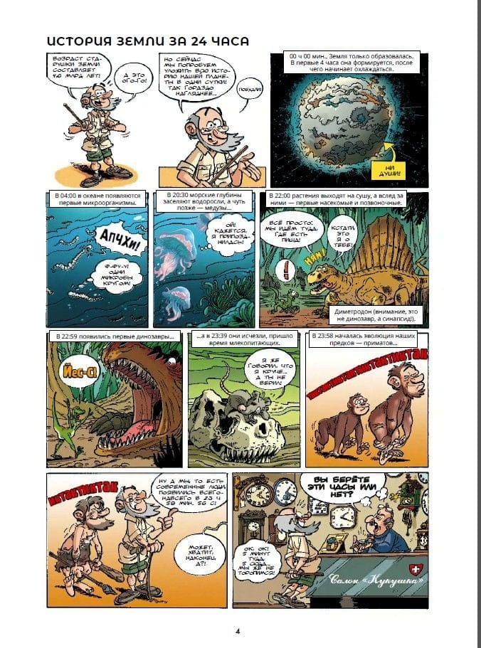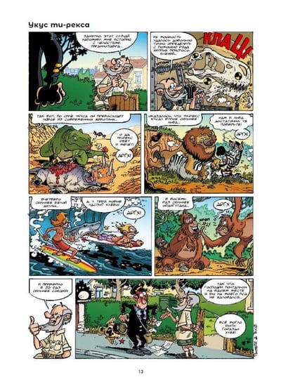Второй том французской серии «Динозавры в комиксах» сценариста Арно Плюмери и художника Блоза продолжает увлекательный рассказ о жизни этих гигантских рептилий… Хотя стоп! Почему обязательно гигантских? Симпатяга компсогнат, к примеру, размером с курицу… Миляга бэмбираптор (представьте, есть и такой!) чуть больше, но тоже отнюдь не гигант. Да и хорошо всем знакомые по фильмам велоцирапторы ростом не превышают и пары метров… То ли дело апатозавр — 29 метров в длину и 30 тонн живого веса! А аргентинозавр? 35 метров и 80 тонн (а по некоторым сведениям, и все 10 0)! Кстати, названия динозавров — отдельная история (и по совместительству — отдельный гэг). Как вам, к примеру, эустрептоспондил?.. А брахитрахелопан?.. Или того пуще — микропахицефалозавр! Да, в юморе палеонтологам не откажешь — и об этом тоже в книге есть гэг. Впрочем, веселились палеонтологи не всегда: «костяные войны», разгоревшиеся в США второй половины XIX века между двумя крупнейшими специалистами по окаменелостям того времени, были безжалостны и беспощадны, как челюсти голодного тираннозавра… Чем они завершились? Об этом вы тоже узнаете из этой книги. Как и о том, зачем конкавенатору горб, теризинозавру — 70-сантиметровые когти, спинозавру — костяной парус на спине, а апатозавру — камни в желудке. А может, и не узнаете — ведь палеонтологи и сами не всегда уверены в своих версиях!