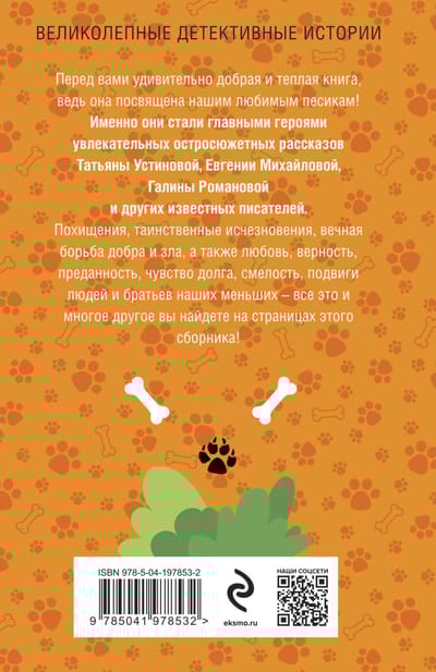 Перед вами удивительно добрая и теплая книга, ведь она посвящена нашим любимым песикам. Именно они стали главными героями увлекательных остросюжетных рассказов Татьяны Устиновой, Евгении Михайловой, Галины Романовой и других известных писателей. Похищения, таинственные исчезновения, вечная борьба добра и зла, а также любовь, верность, преданность, чувство долга, смелость, подвиги людей и братьев наших меньших — все это и многое другое вы найдете на страницах этого сборника.