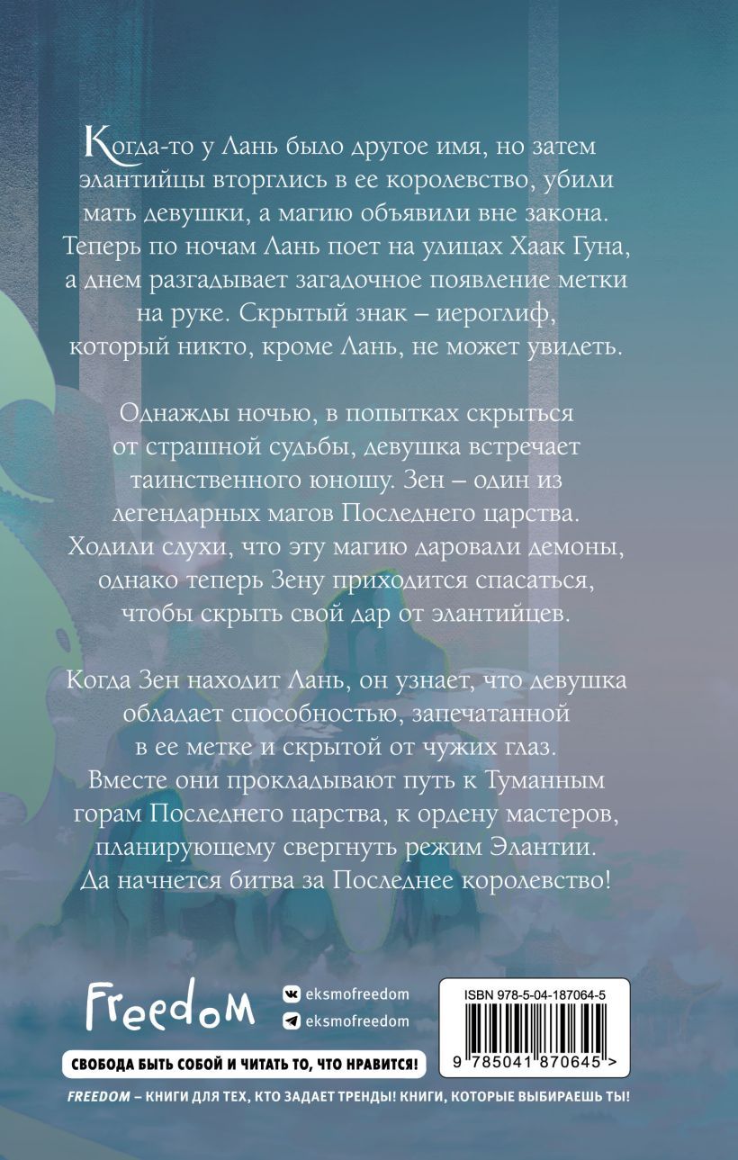 Однажды ночью, в попытках скрыться от страшной судьбы, девушка встречает таинственного юношу. Зен — один из легендарных магов Последнего царства. Ходили слухи, что эту магию даровали демоны, однако теперь Зену приходится спасаться, чтобы скрыть свой дар от элантийцев. Когда Зен находит Лань, он узнает, что девушка обладает способностью, запечатанной в ее метке и скрытой от чужих глаз. Вместе они прокладывают путь к Туманным горам Последнего царства, к ордену мастеров, планирующим свергнуть режим Элантии. Да начнется битва за Последнее Королевство!