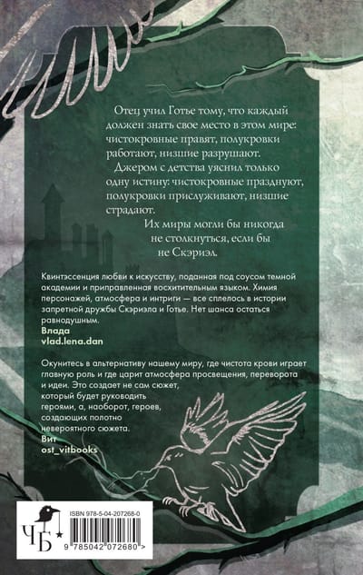 Отец учил Готье тому, что каждый должен знать свое место в этом мире. Чистокровные правят. Полукровки работают. Низшие разрушают. Джером с детства уяснил только одну истину. Чистокровные празднуют. Полукровки прислуживают. Низшие страдают. Их миры могли никогда не столкнуться, если бы не Скэриэл. Первая книга Young Adult-цикла в жанре dark academy. Действие романа происходит в альтернативном мире, очень похожем на наш, общество в котором поделено на три сословия: чистокровные, полукровки, низшие. Проблемы отцов и детей, классовое неравенство, дружба и любовь, рассуждения о Сергее Дягилеве и Александре Македонском, поиск себя и истины, императорские интриги и дух революции — это «Песнь Сорокопута». Повествование в романе ведется от двух персонажей разных сословий, что дает возможность более ярко раскрыть мир, помогает сопереживать героям, держит в напряжении.