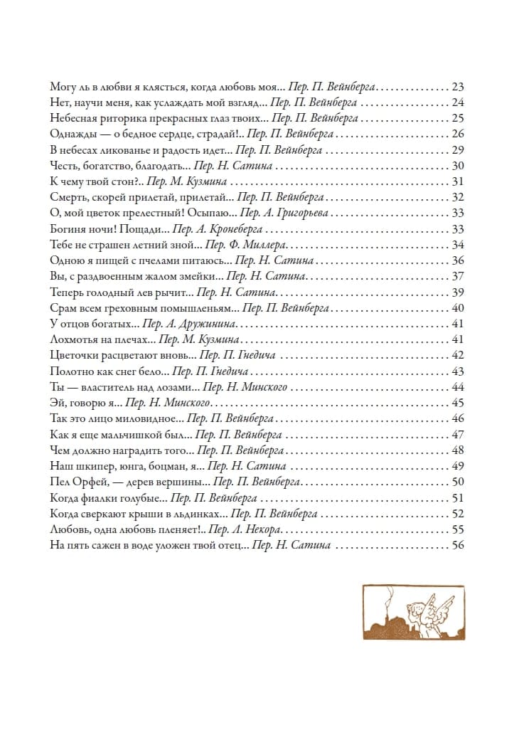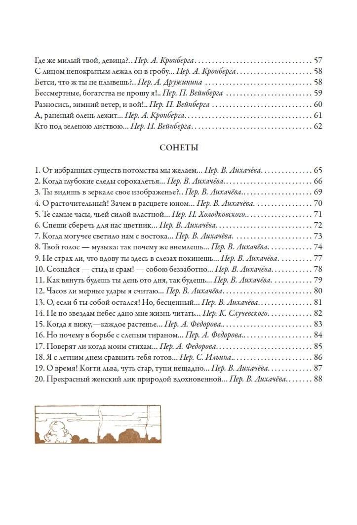 Сборник произведений Вильяма Шекспира (1564–1616) в переводах различных литераторов включает сто пятьдесят четыре сонета, тридцать семь песен, а также пять поэм: «Феникс и голубка», «Жалоба влюбленной», «Венера и Адонис», «Лукреция» и «Страстный пилигрим». Издание украшают буквицы, заставки и иллюстрации британского художника Чарльза Робинсона (1870–1937).