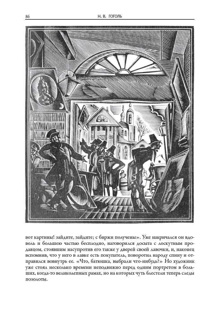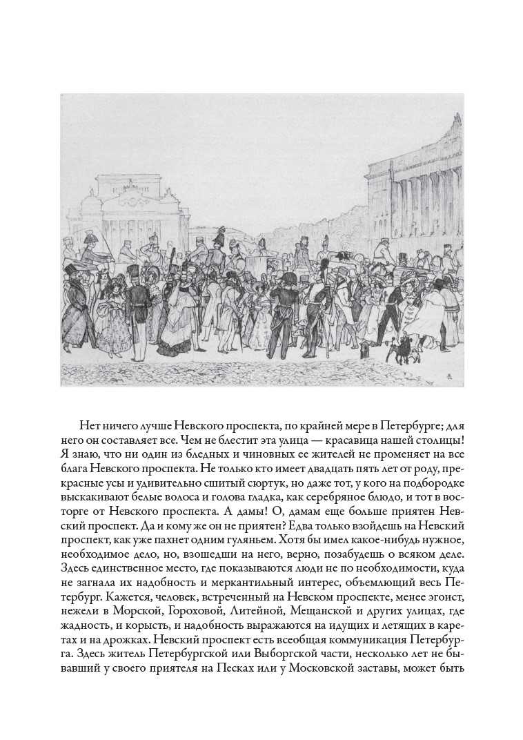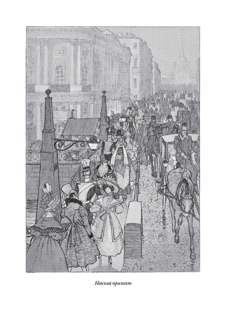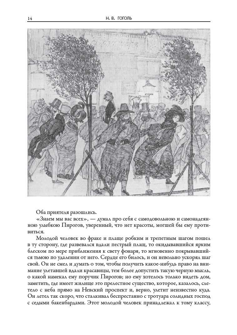 В сборник вошли «петербургские повести» классика русской и мировой литературы Николая Васильевича Гоголя (1809–1852): «Невский проспект», «Нос», «Портрет», «Шинель» и «Записки сумасшедшего», а также две «непетербургские» повести: «Коляска» и «Рим», традиционно печатаемые вместе с ними согласно авторскому замыслу. Книга проиллюстрирована 132 рисунками художников Игоря Эммануиловича Грабаря (Храброва) (1871–1960), Николая Андреевича Зубчанинова (1866–1908), Дмитрия Николаевича Кардовского (1866–1943), Алексея Ильича Кравченко (1889–1940), Ральфа Федоровича Штейна (1854–1896) и 28 гравюрами с актера Василия Николаевича Андреева-Бурлака (1843–1888).