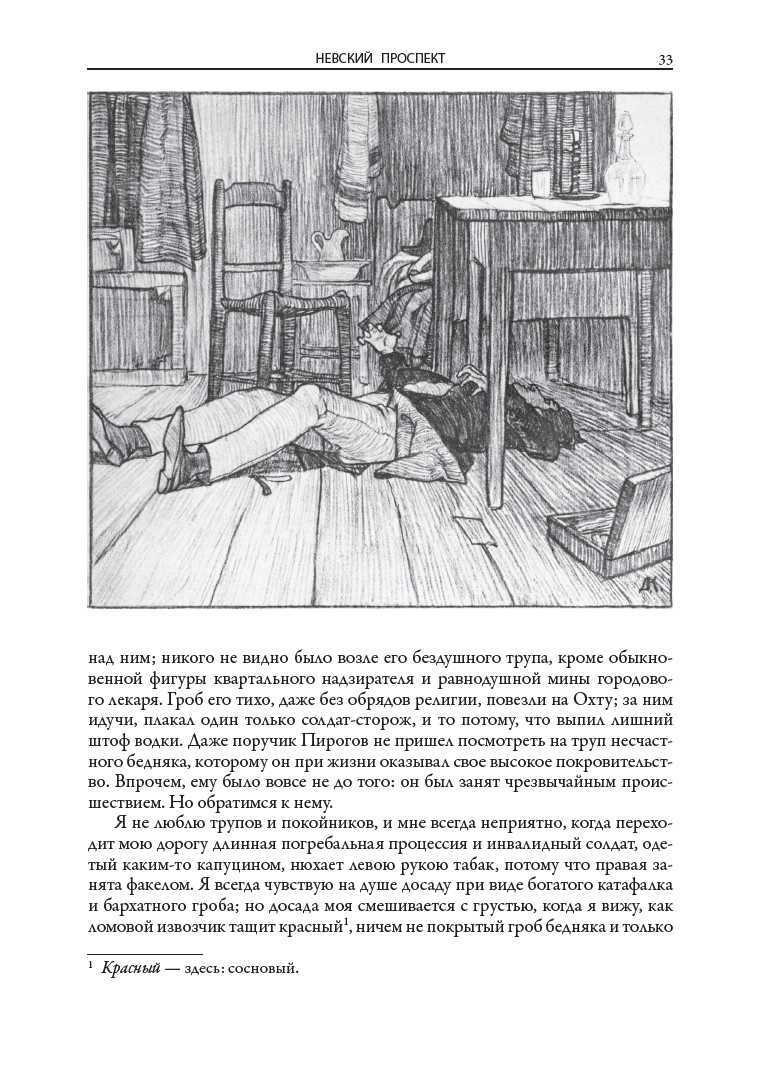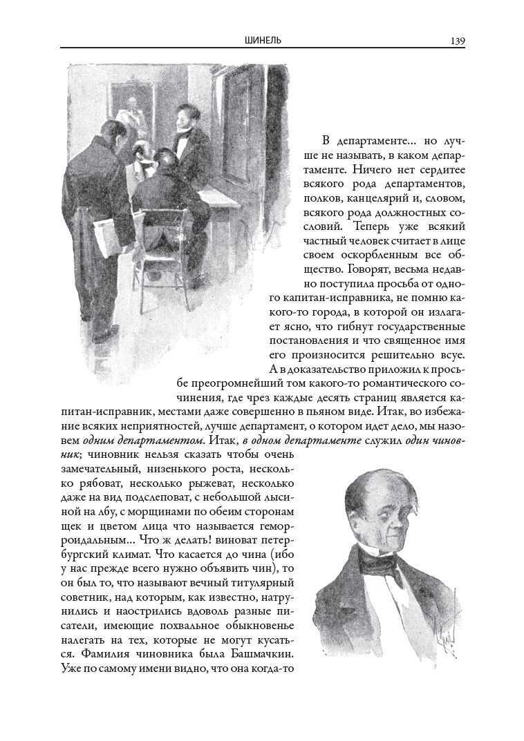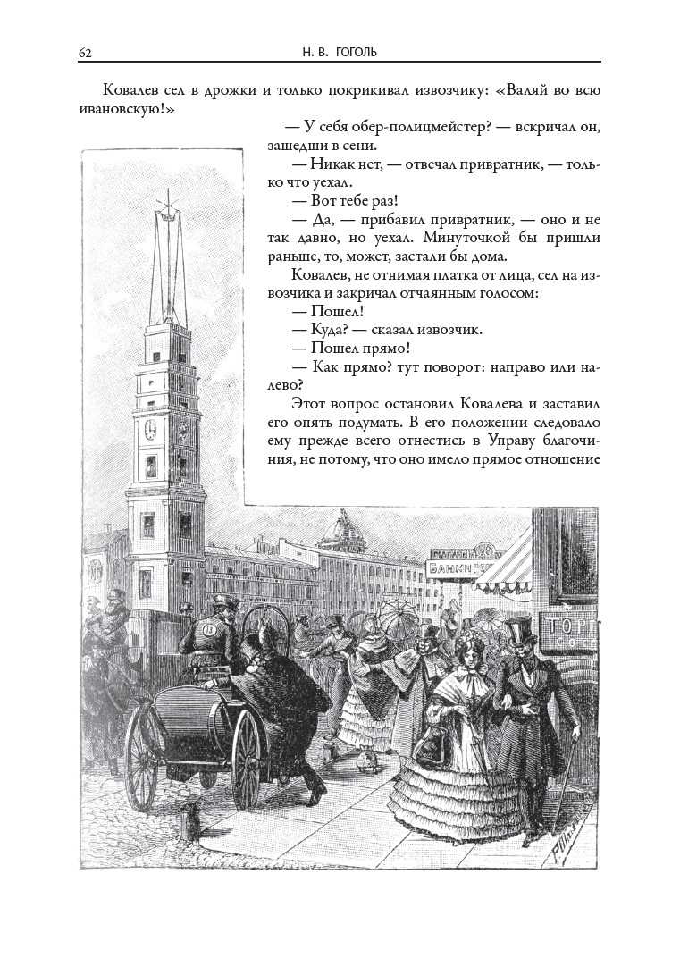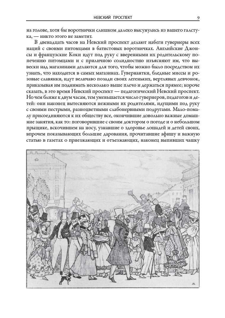 В сборник вошли «петербургские повести» классика русской и мировой литературы Николая Васильевича Гоголя (1809–1852): «Невский проспект», «Нос», «Портрет», «Шинель» и «Записки сумасшедшего», а также две «непетербургские» повести: «Коляска» и «Рим», традиционно печатаемые вместе с ними согласно авторскому замыслу. Книга проиллюстрирована 132 рисунками художников Игоря Эммануиловича Грабаря (Храброва) (1871–1960), Николая Андреевича Зубчанинова (1866–1908), Дмитрия Николаевича Кардовского (1866–1943), Алексея Ильича Кравченко (1889–1940), Ральфа Федоровича Штейна (1854–1896) и 28 гравюрами с актера Василия Николаевича Андреева-Бурлака (1843–1888).