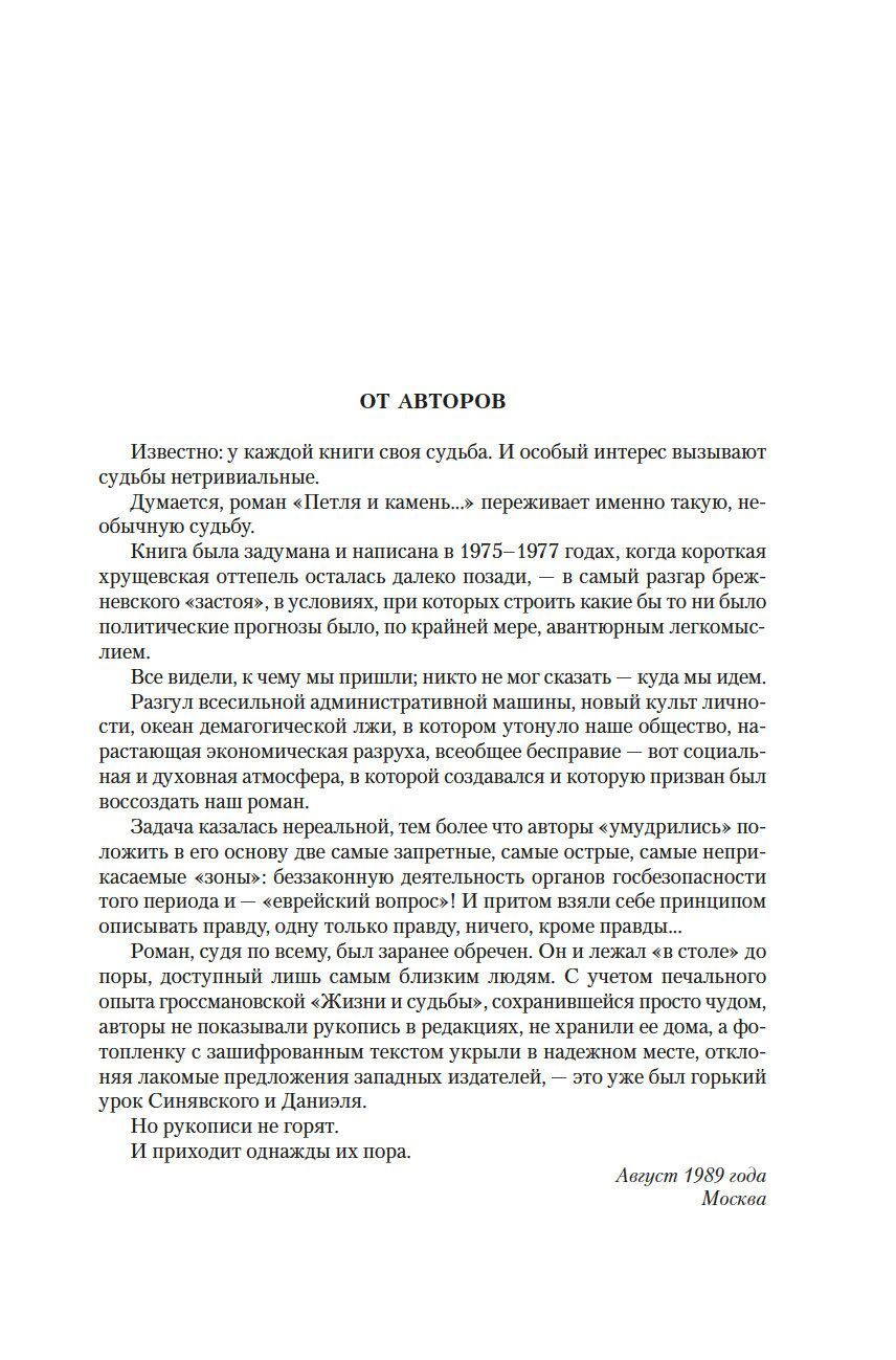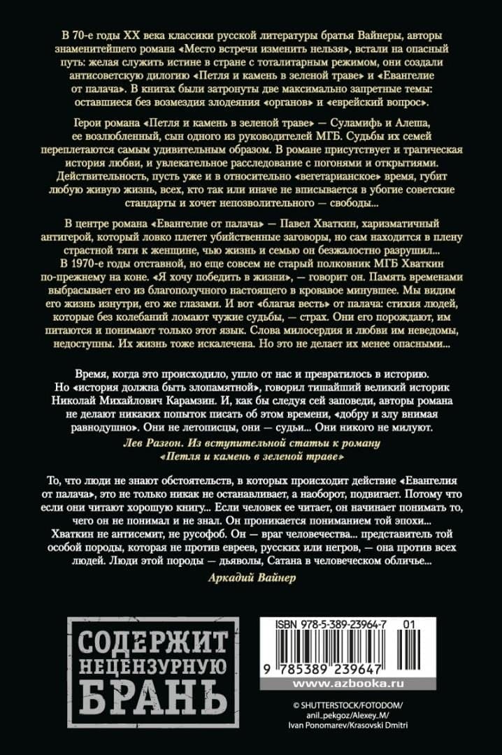 В 70-е годы ХХ века классики русской литературы братья Вайнеры, авторы знаменитейшего романа «Место встречи изменить нельзя», встали на опасный путь: желая служить истине в стране с тоталитарным режимом, они создали антисоветскую дилогию «Петля и камень в зеленой траве» и «Евангелие от палача». В книгах были затронуты две максимально запретные темы: оставшиеся без возмездия злодеяния «органов» и «еврейский вопрос». Герои романа «Петля и камень в зеленой траве» — Суламифь и Алеша, ее возлюбленный, сын одного из руководителей МГБ. Судьбы их семей переплетаются самым удивительным образом. В романе присутствует и трагическая история любви, и увлекательное расследование с погонями и открытиями. Действительность, пусть уже и в относительно «вегетарианское» время, губит любую живую жизнь, всех, кто так или иначе не вписывается в убогие советские стандарты и хочет непозволительного — свободы… В центре романа «Евангелие от палача» — Павел Хваткин, харизматичный антигерой, который ловко плетет убийственные заговоры, но сам находится в плену страстной тяги к женщине, чью жизнь и семью он безжалостно разрушил… В 1970-е годы отставной, но еще совсем не старый полковник МГБ Хваткин по-прежнему на коне. «Я хочу победить в жизни», — говорит он. Память временами выбрасывает его из благополучного настоящего в кровавое минувшее. Мы видим его жизнь изнутри, его же глазами. И вот «благая весть» от палача: стихия людей, которые без колебаний ломают чужие судьбы, — страх. Они его порождают, им питаются и понимают только этот язык. Слова милосердия и любви им неведомы, недоступны. Их жизнь тоже искалечена. Но это не делает их менее опасными…