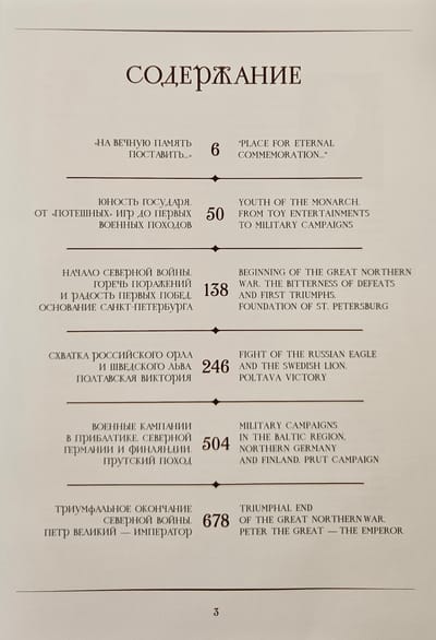 Большое внимание в книге уделено проведению Петром военных реформ, формированию национального офицерского корпуса, становлению военного образования в России, а также принятию на вооружение новых образцов артиллерийских систем, ручного огнестрельного и холодного оружия, унификации военной формы. Книга богато иллюстрирована и содержит большое количество изображений оружия, униформы и снаряжения, знамен, наградных и памятных медалей, музыкальных инструментов, живописи и графики, а также редких изданий и документов. Большинство этих памятников военной истории петровской России сохранились в единственном экземпляре, имеют собственную историю и публикуются впервые.