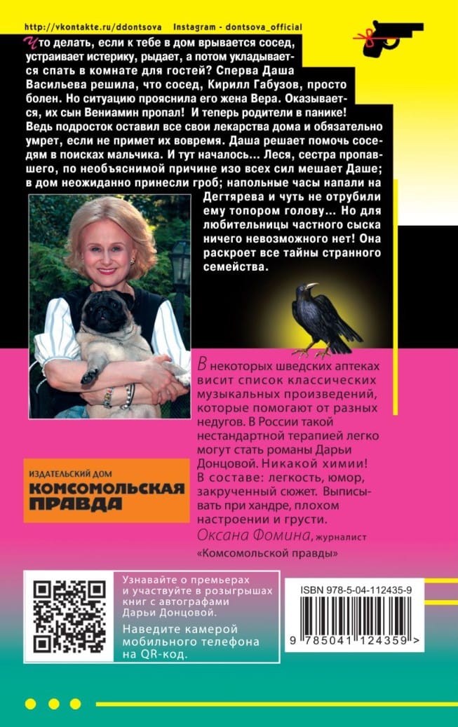 Что делать, если к тебе в дом врывается сосед, устраивает истерику, рыдает, а потом укладывается спать в комнате для гостей? Сперва Даша Васильева решила, что сосед, Кирилл Габузов, просто болен. Но ситуацию прояснила его жена Вера. Оказывается, их сын Вениамин пропал! И теперь родители в панике! Ведь подросток оставил все свои лекарства дома и обязательно умрет, если не примет их вовремя. Даша решает помочь соседям в поисках мальчика. И тут началось… Леся, сестра пропавшего, по необъяснимой причине изо всех сил мешает Даше; в дом неожиданно принесли гроб; напольные часы напали на Дегтярева и чуть не отрубили ему топором голову… Но для любительницы частного сыска ничего невозможного нет! Она раскроет все тайны странного семейства.