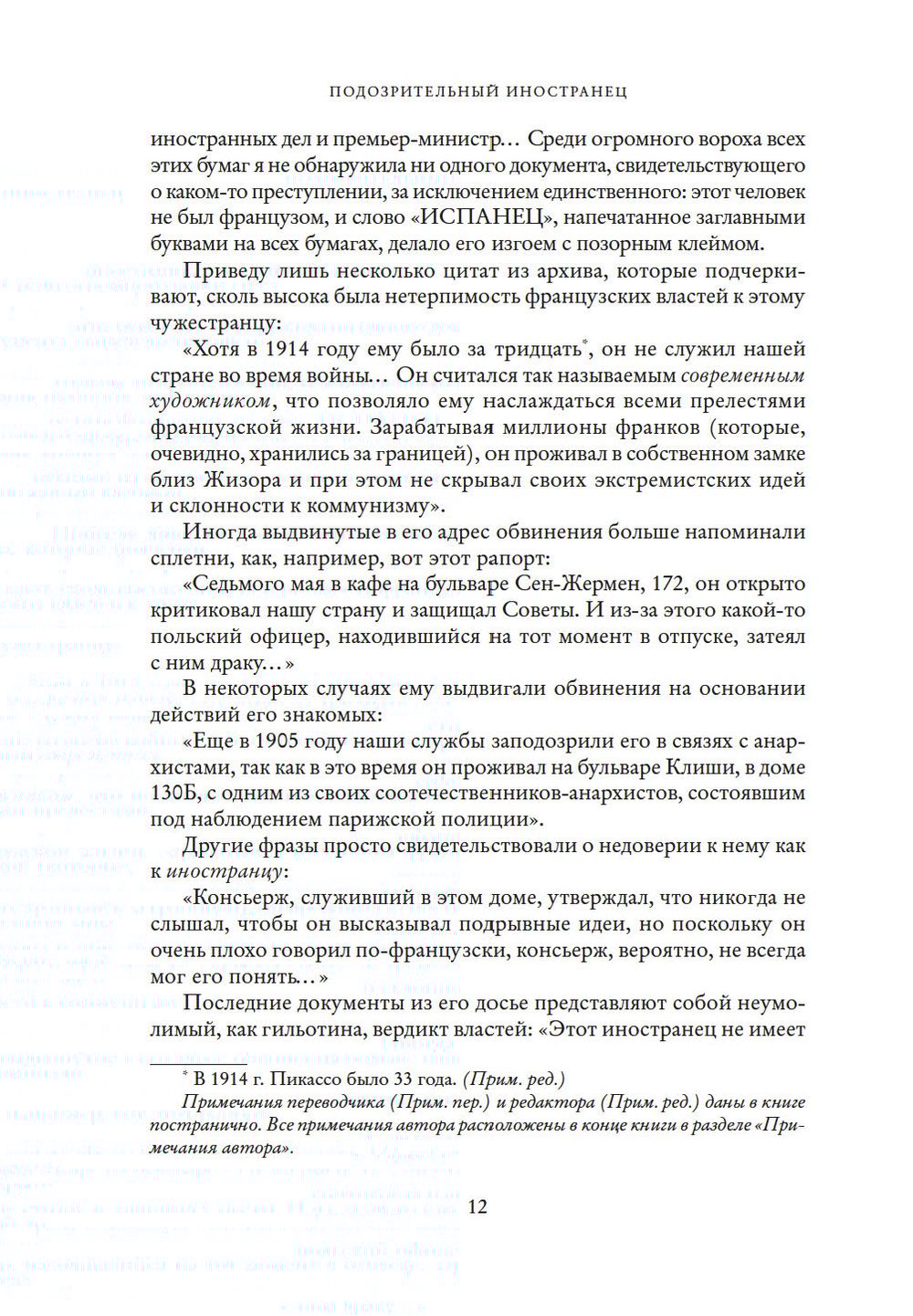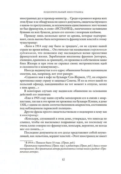 Прежде чем Пикассо стал культовым художником и одной из ключевых фигур искусства XX века, он был «подозрительным иностранцем» для французской полиции. Его подозревали в связях с террористами-анархистами, обвиняли в политическом и художественном радикализме и подрыве устоев французского общества. Авангардные стили, в которых он работал, вызывали неприятие у критиков, коллег из мира искусства, консервативной публики. Художник запрашивал французское гражданство, но ему было отказано, и он так и не стал гражданином Франции, хотя во многом именно благодаря ему Франция сохранила в XX веке статус культурного лидера. Анни Коэн-Солаль на основе огромного объема забытых и введенных ею в научный оборот архивных источников показывает, как благодаря таланту, характеру и вере в себя Пикассо двигался вперед к признанию, благосостоянию и влиянию в мире искусства, кто помогал и кто мешал ему на этом пути.