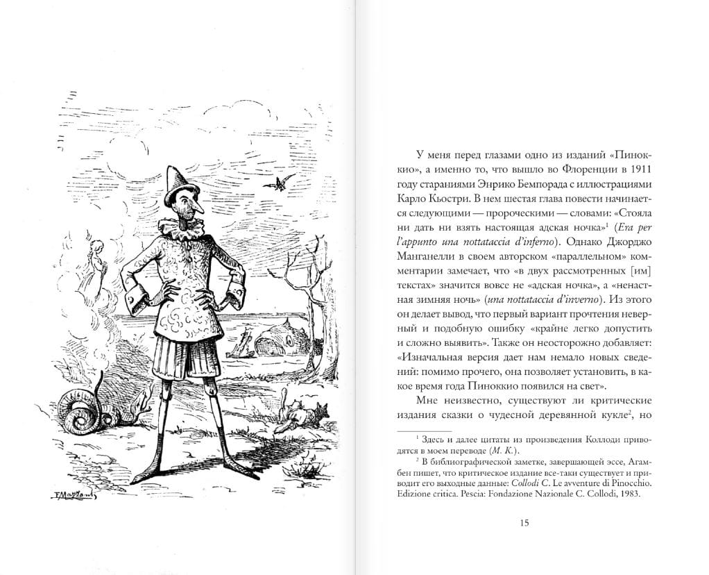 Знаменитое произведение Карло Коллоди подвергалось самым разным интерпретациям: от масонской и эзотерической до теологической и философской. Ведь под живостью языка и веселым сюжетом можно обнаружить богатство, сложность и множественность смыслов. Джорджо Агамбен обращает свой острый философский взгляд на историю знаменитой марионетки и предлагает собственную тонкую интерпретацию.