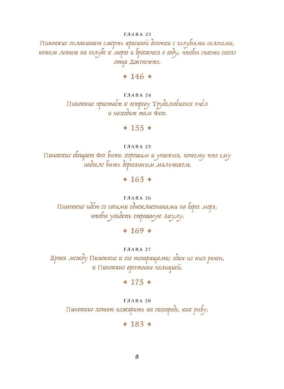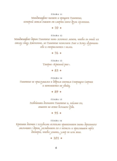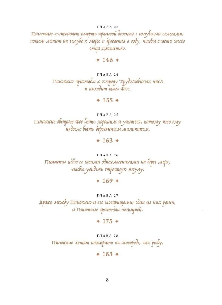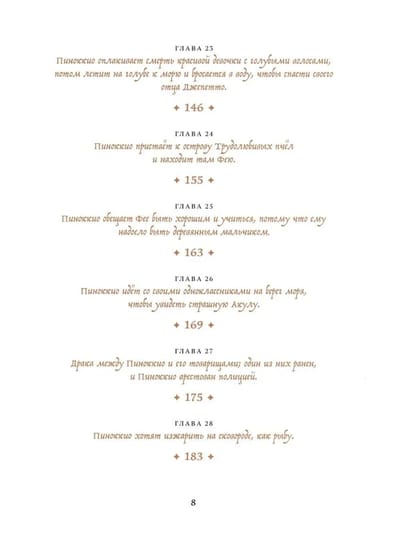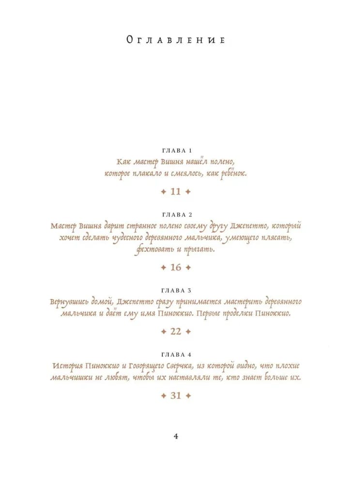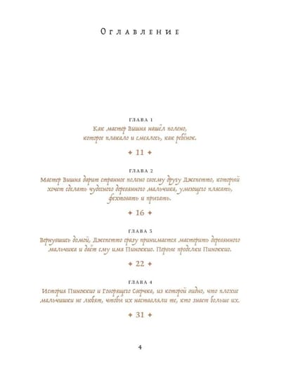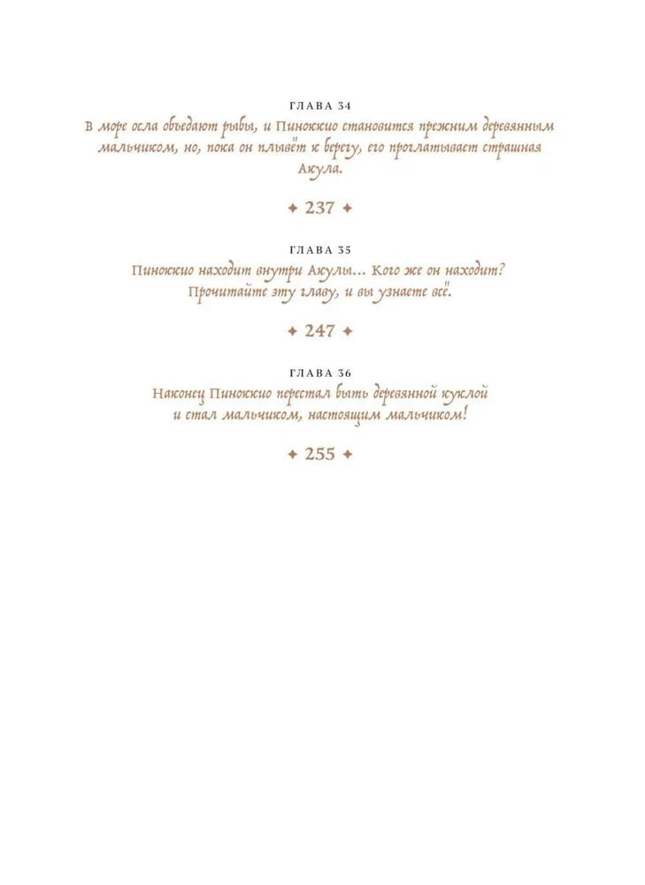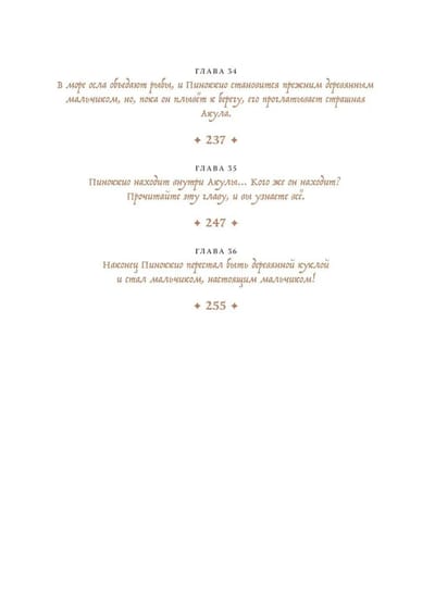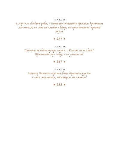 Сказка о Пиноккио — одна из самых известных и любимых историй в мировой литературе. Хотя для большинства российских детей его заменил Буратино, а также множество мультфильмов и киноинтерпретаций. Однако в оригинале совсем другой сюжет и совсем другая философия, и есть даже библейские отсылки. Это история взросления, возрастания из существа бессмысленного в любящего сына, который рискует своей жизнью, чтобы спасти отца. Это история о человечности. Какой бы ни был Пиноккио озорной бездельник, в какие бы ни попадал передряги, у него остается доброе сердце и недосягаемая мечта — стать настоящим мальчиком. И читатели всех поколений всем сердцем любят его и желают его мечте сбыться.