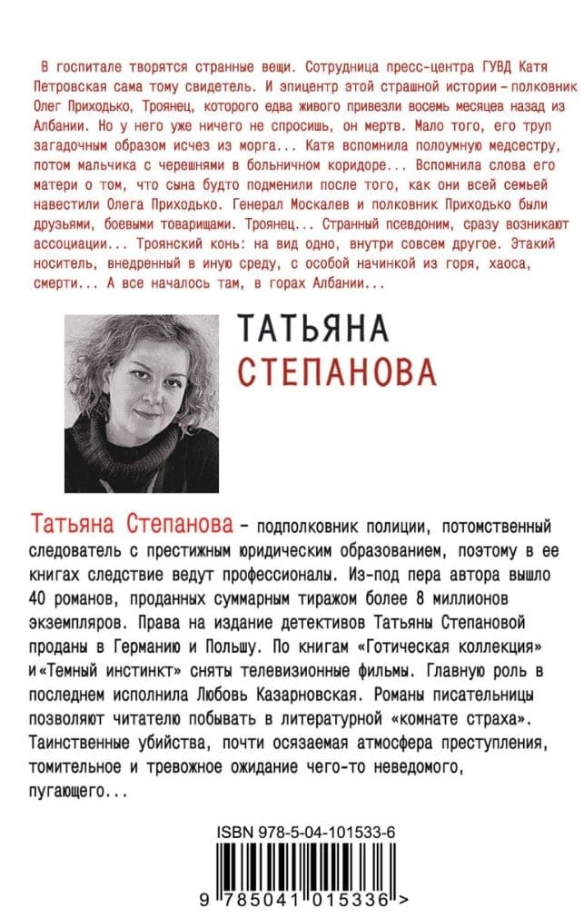 В госпитале творятся странные вещи. Сотрудница пресс-центра ГУВД Катя Петровская сама тому свидетель. И эпицентр этой страшной истории полковник Олег Приходько – Троянец, которого едва живого привезли восемь месяцев назад из Албании. Но у него уже ничего не спросишь, он мертв. Мало того, его труп загадочным образом исчез из морга... Катя вспомнила полоумную медсестру, потом мальчика с черешнями в больничном коридоре... Вспомнила слова его матери о том, что сына будто подменили после того, как они всей семьей навестили Олега Приходько. Генерал Москалев и полковник Приходько были друзьями, боевыми товарищами. Троянец... Странный псевдоним, сразу возникают ассоциации... Троянский конь: на вид одно, внутри совсем другое. Этакий носитель, внедренный в иную среду, с особой начинкой из горя, хаоса, смерти... А все началось там, в горах Албании...