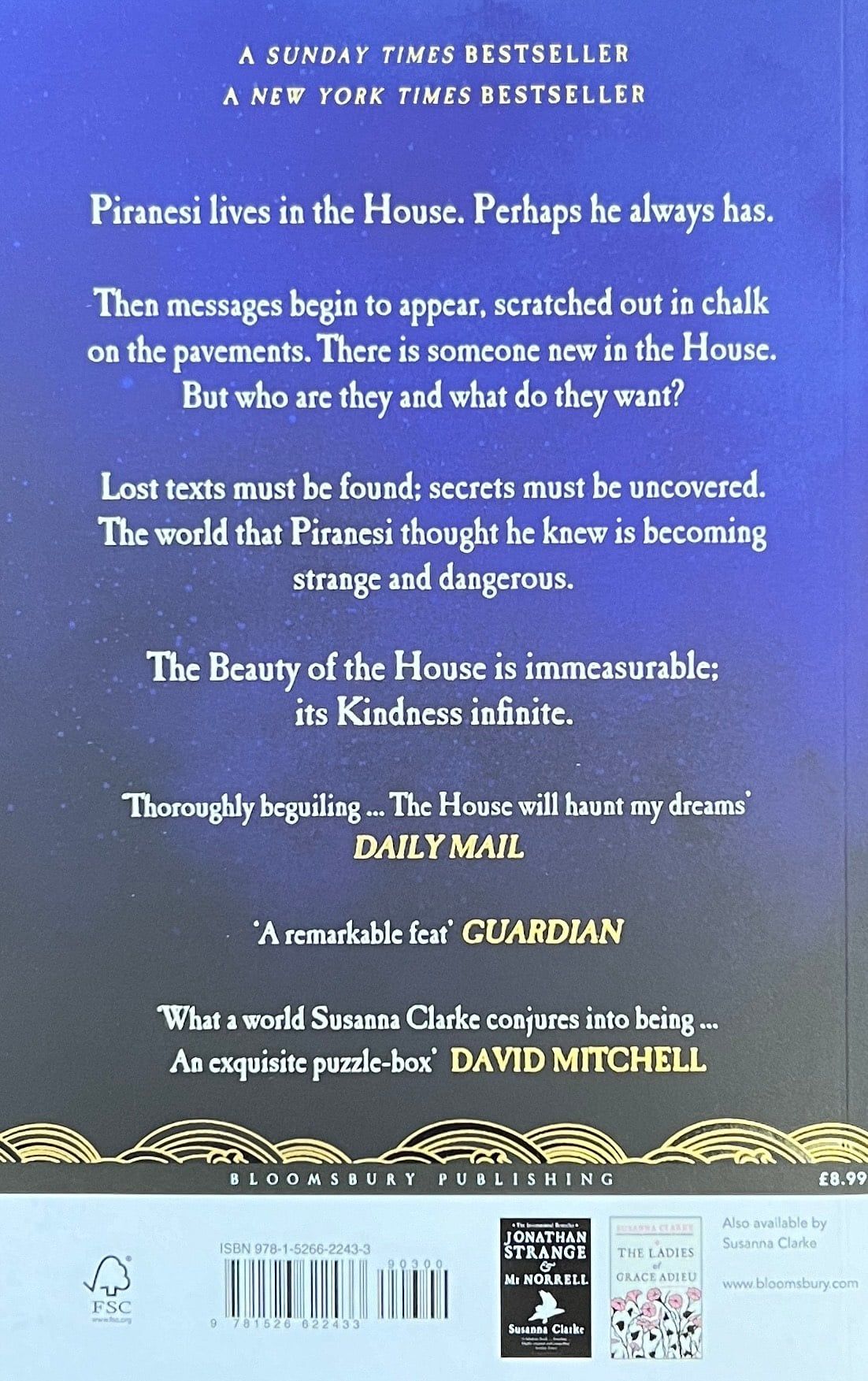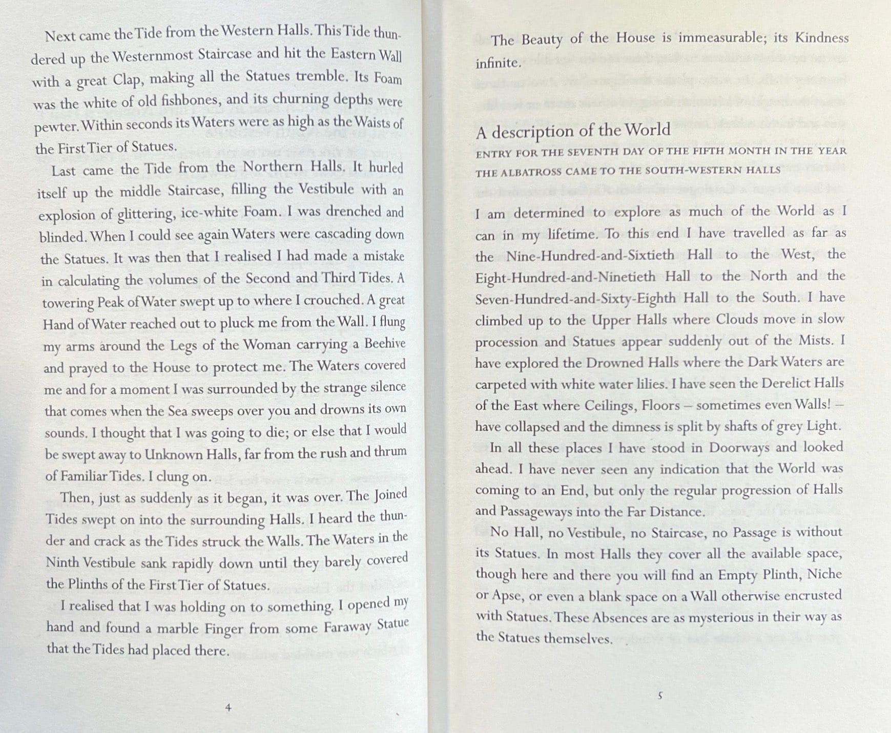 Piranesi lives in the House. Perhaps he always has. In his notebooks, day after day, he makes a clear and careful record of its wonders: the labyrinth of halls, the thousands upon thousands of statues, the tides that thunder up staircases, the clouds that move in slow procession through the upper halls. On Tuesdays and Fridays Piranesi sees his friend, the Other. At other times he brings tributes of food to the Dead. But mostly, he is alone. Messages begin to appear, scratched out in chalk on the pavements. There is someone new in the House. But who are they and what do they want? Are they a friend or do they bring destruction and madness as the Other claims? Lost texts must be found; secrets must be uncovered. The world that Piranesi thought he knew is becoming strange and dangerous.The Beauty of the House is immeasurable; its Kindness infinite.