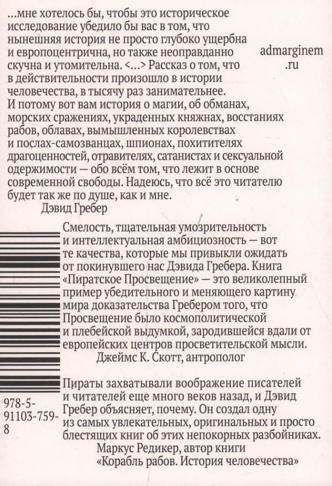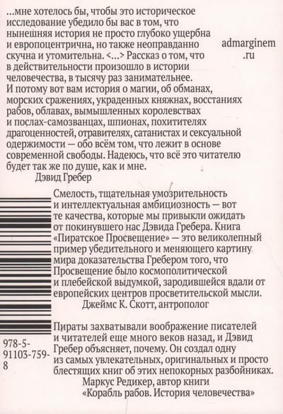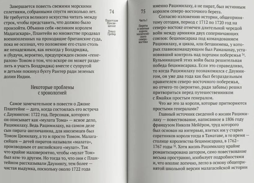 Эта книга — смелая попытка вернуть антропологии и этнографии ее изначальную цель: поиск альтернативного взгляда на развитие общества и культуры. Гребер «деколонизирует Просвещение», доказывая, что истоки идей равенства, свободы и справедливости стоит искать за пределами «западной цивилизации». Он однозначно утверждает — те самые вымышленные эгалитарные «пиратские королевства» вроде Либерталии так или иначе существовали на самом деле. На примере Конфедерации бецимисарака Гребер описывает устройство реального проекта «общества будущего», о котором лишь фантазировал Томас Мор и другие авторы утопий.