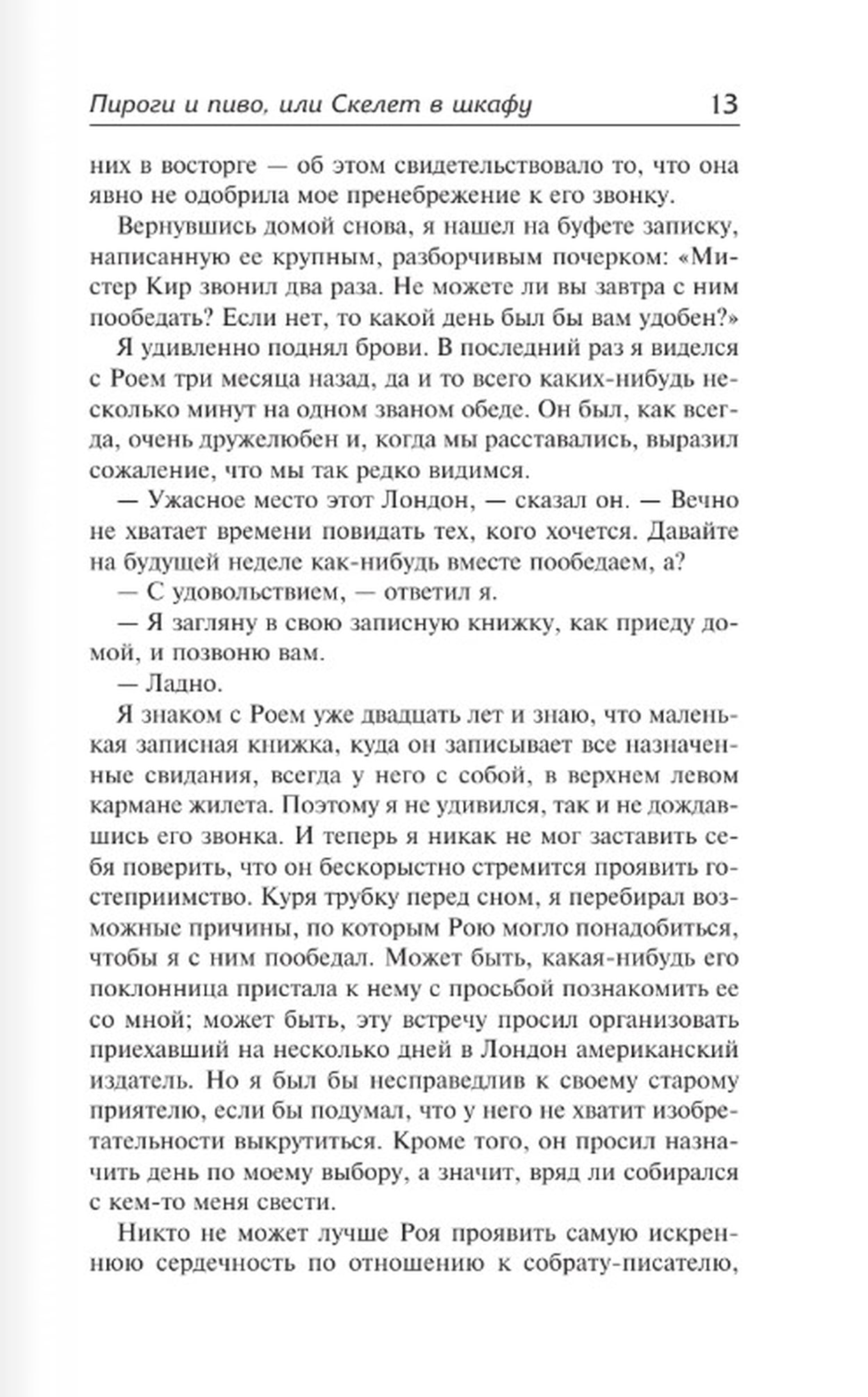 В центре повествования романа «Пироги и пиво, или Скелет в шкафу» — судьба знаменитого английского писателя Эдуарда Дриффилда, чей творческий путь был противоречив и тернист. На заре карьеры он слыл безыскусным реалистом, которого презирал весь город и отвергала литературная среда, а в конце жизни стал признанным классиком. Доказывает ли это, что писатель — не просто профессия, а особый образ мыслей и действий?