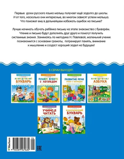 Первые уроки русского языка малыш получает ещё задолго до школы. И от того, насколько они интересные, во многом зависят успехи малыша. Что поможет ему в дальнейшем избежать ошибок на письме? Лучше начинать обучать ребёнка письму на этапе знакомства с букварём. Чтение и письмо будут дополнять друг друга и помогут получить системные знания. Занимаясь по методике Н. Павловой, маленький ученик познакомится с основами грамоты, потренирует память, внимание и мышление и создаст хороший задел на будущее!