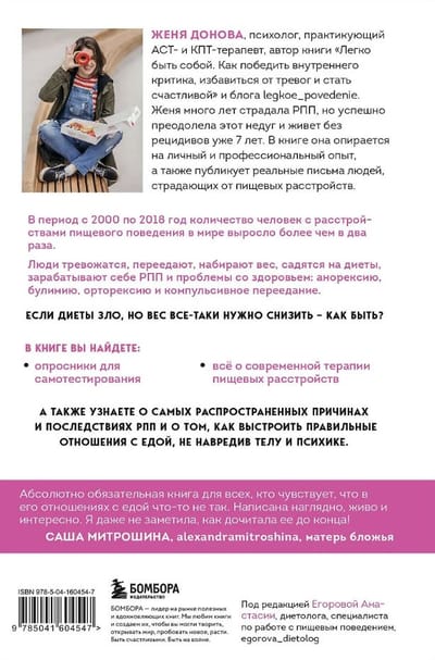 Из новой книги практикующего психолога Жени Доновой вы узнаете, откуда берется недовольство собственным телом, какие самые распространенные причины и последствия РПП, что считается нормой, а что тревожным звоночком, какая терапия пищевых расстройств применима сегодня. Вы поймете, как выстроить правильные отношения с едой, не навредив телу и психике.