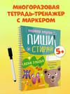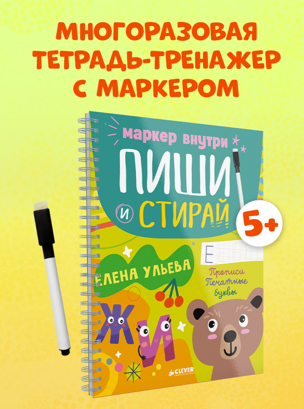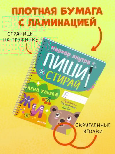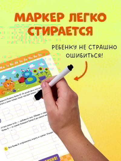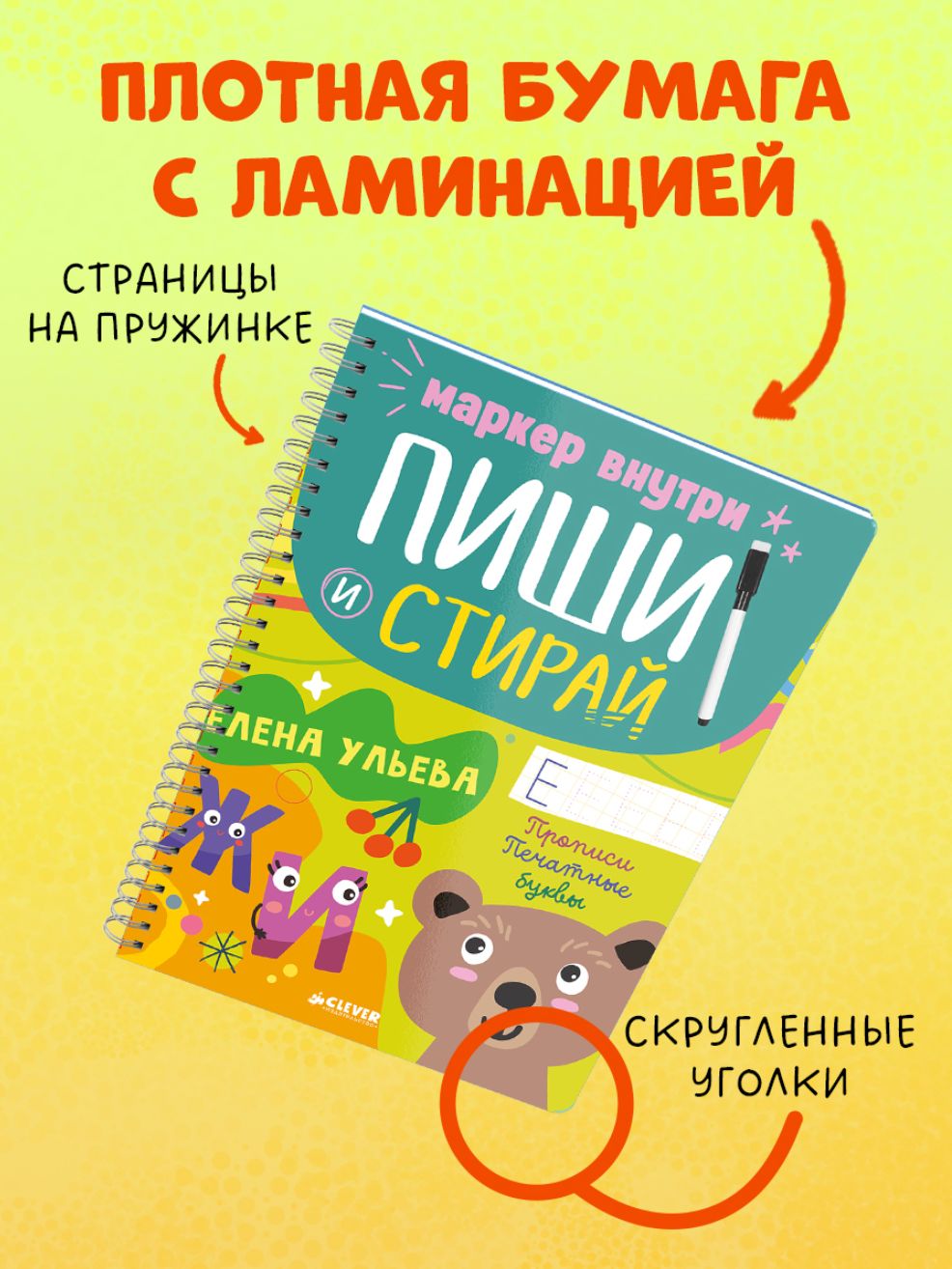 При работе в тетради «Прописи. Печатные буквы» не страшно ошибаться: в комплекте есть маркер, след которого легко стирается с ламинированных страниц ластиком или салфеткой.