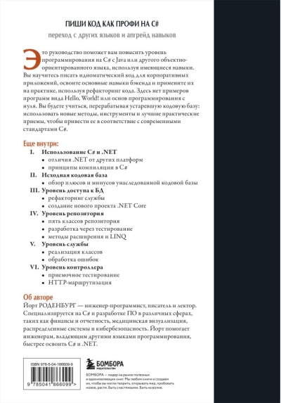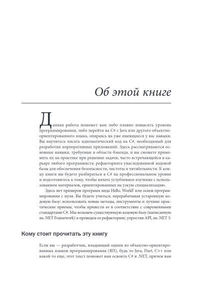Это руководство поможет вам повысить уровень программирования на C# с Java или другого объектно-ориентированного языка, используя имеющиеся навыки. Вы научитесь писать идиоматический код для корпоративных приложений, освоите основные навыки бэкенда и примените их на практике, используя рефакторинг кода. Здесь нет примеров программ вида Hello, World! или основ программирования с нуля. Вы будете учиться, перерабатывая устаревшую кодовую базу: использовать новые методы, инструменты и лучшие практические приемы, чтобы привести ее в соответствие с современными стандартами C#.