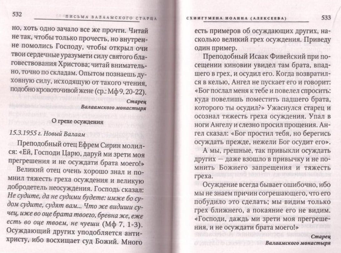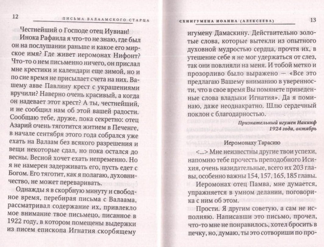 Одна из самых значимых духовных книг XX века, — «Пись­ма валаамского старца», — содержит переписку схиигумена Иоанна (Алексеева) с разными лицами. Мирный дух и отеческая любовь, коими она пронизана, и сами по себе целят душу чита­ющего. Но в наше скудное на духовных наставников время пись­ма старца приобретают ценность настоящего бриллианта. Этот кладезь духовного опыта поможет и чисто практическими сове­тами, и рассуждением о глубинах человеческого сердца всем, пы­тающимся проводить духовную жизнь в современном мире.