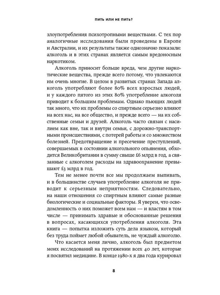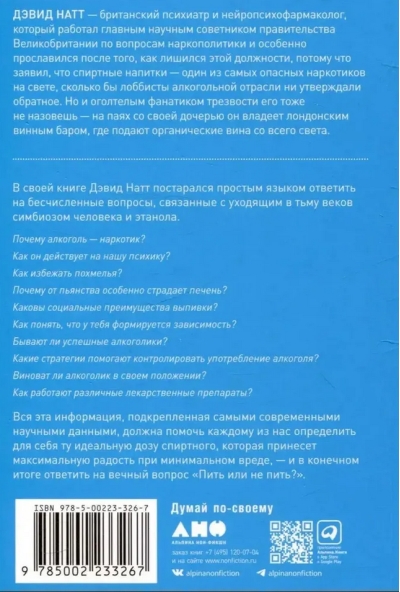 В своей книге Натт постарался простым языком ответить на бесчисленные вопросы, связанные с уходящим во тьму веков симбиозом человека и этанола. Почему алкоголь — наркотик? Как он действует на нашу психику? Как избежать похмелья? Почему от пьянства особенно страдает печень? Каковы социальные преимущества выпивки? Как понять, что у тебя формируется зависимость? Бывают ли успешные алкоголики? Какие стратегии помогают контролировать употребление алкоголя? Виноват ли алкоголик в своем положении? Как работают различные лекарственные препараты для лечения алкогольной зависимости? Что должны предпринимать в этой связи правительства?
