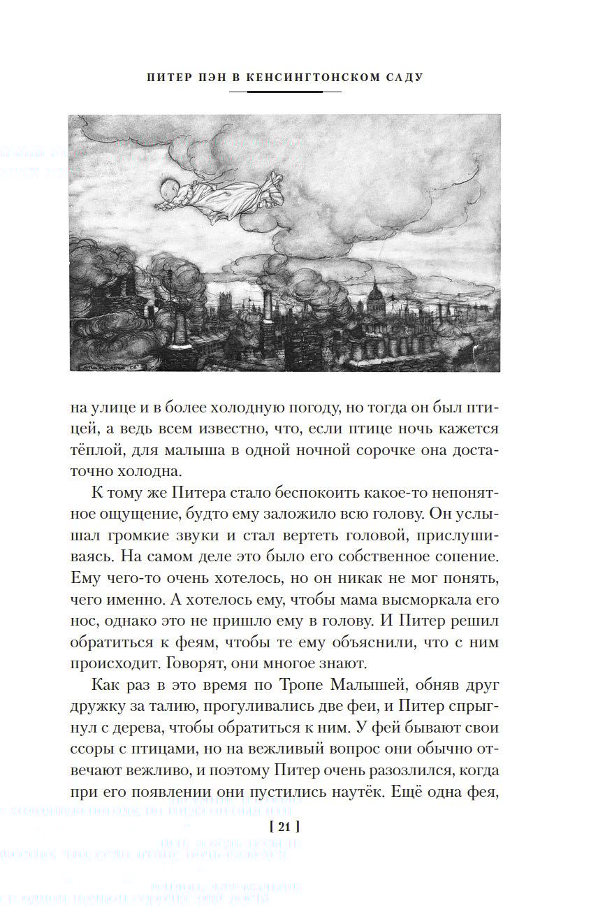 Однажды в окно дома семейства Дарлинг влетел мальчик по имени Питер Пэн и позвал Венди и двух её братьев с собой на Нигдешний остров… Так началась история, полная увлекательных приключений, в месте, где дети никогда не взрослеют, в лесах обитают прекрасные феи, а море бороздят свирепые пираты — стоит лишь зазеваться, тут же угодишь к ним в плен! Книги о Питере Пэне давно покорили сердца миллионов читателей. Неудивительно, что они были переведены на 70 языков и принесли своему автору Джеймсу Барри вечную славу. «Дети воды» Чарльза Кингсли и «Ветер в ивах» Кеннета Грэма не уступают в сказочности истории о Питере Пэне. Все эти произведения навсегда вошли в список классики мировой литературы и были отмечены престижными премиями и вот наконец собраны под одной обложкой. По-настоящему волшебными повести получились не только благодаря богатой фантазии авторов, но и великолепным иллюстрациям, выполненным признанными мастерами своего дела — художниками Артуром Рэкхемом, Элис Болингброк Вудворд и Уильямом Хитом Робинсоном.