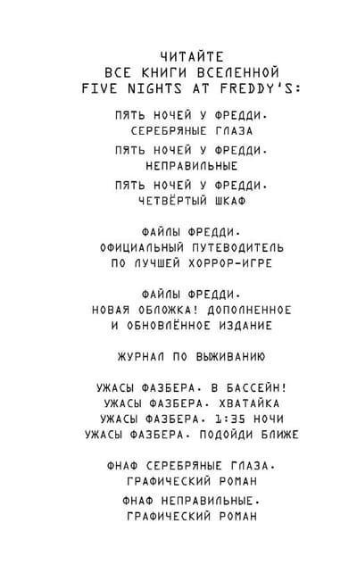 Что случилось с Чарли? Этот вопрос продолжает мучать Джона. Его преследуют ночные кошмары, в которых его девушка умирает в костюме аниматроника. Он хочет забыть трагедию, произошедшую в пиццерии «Фредди Фазбера»... Как-то бессонной ночью, бродя по городу, он встречает старую подругу Джессику, которая приглашает его на встречу друзей и умоляет поговорить с Чарли, которая очень страдает из-за его холодности. Вот только Джон абсолютно уверен, что его Чарли умерла… Потрясающая книга по суперпопулярной у подростков компьютерной игре и франшизе «Five Nights at Freddy's»! Роман расширяет вселенную «Five Nights at Freddy's», позволяя читателю не только проникнуться духом игры, но и узнать предысторию.