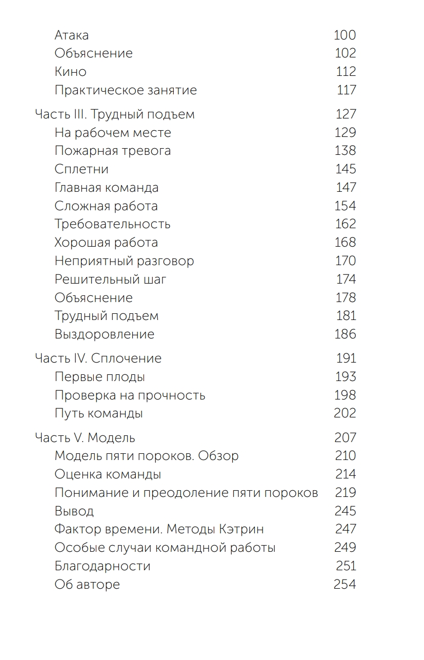Почему возникают «пять пороков команды» — взаимное недоверие, нетребовательность, безответственность, боязнь конфликта и безразличие к результатам, как их диагностировать и что с ними делать? В первой части книги эти вопросы решает Кэтрин со своей командой, а во второй автор приводит подробное описание этих «пяти пороков команды» и методы их устранения.