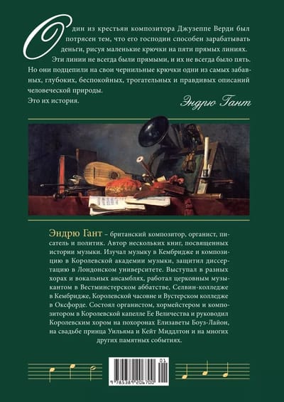 Эндрю Гант изображает музыку в контексте основных вех нашей истории. Трубадуры, исполняющие свои песни под сводами средневековых замков. Томас Таллис, служивший четырем разным монархам XVI века, в том числе Елизавете I. «Пираты», печатавшие поддельные копии музыкальных произведений. Жан-Батист Люлли, чья музыка радовала «короля-солнце» Людовика XIV, а также Шуберт, Чайковский, Шостакович, Элла Фицджеральд, Дэвид Боуи, Эндрю Ллойд Уэббер и многие другие — все их жизни тесно переплелись на ярком и драматичном, забавном и трогательном полотне музыкальной истории.