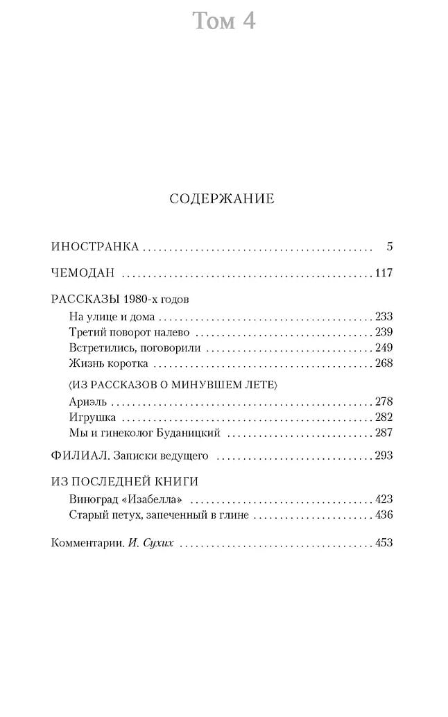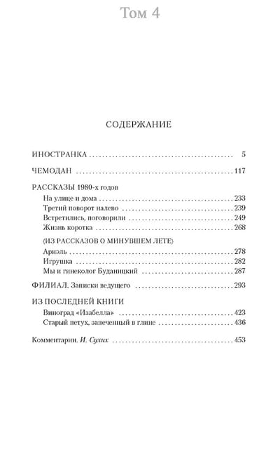 В четвертый том вошли такие знаменитые произведения С. Довлатова, как «Иностранка», «Чемодан», «Филиал», а также рассказы 1980-х годов.