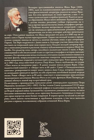 Всемирно прославившийся писатель Жюль Верн (1828–1905), один из основоположников приключенческой и научно-фантастической литературы, родился на западе Франции. Его отец происходил из семьи юристов, а мать — из семьи судовладельцев и кораблестроителей. Родители уделяли образованию Жюля много внимания: будущий писатель с детства посещал различные учебные учреждения, где в числе прочих предметов изучал языки, географию и риторику. Особенно мальчик интересовался литературой: с юных лет он зачитывался приключенческими романами, отдавая предпочтение тем из них, в которых действие происходило на море. Отец-адвокат надеялся, что Жюль продолжит его дело, и в 1848 году он отправил сына в Париж изучать юриспруденцию. Однако сам молодой человек к юридическому поприщу никогда не тяготел и, окончив обучение, вошел в круг литераторов Парижа. Там Верн подружился с Дюма-сыном и, благодаря участию Дюма-отца, смог поставить на театральной сцене свою первую пьесу. Позднее молодой литератор перешел к написанию романов и рассказов, поначалу публиковавшихся в журнале Musée des familles. Его редактор искал автора, способного увлекательно писать о науке, и Верн, совмещавший в себе писательский талант со страстью к географии и истории, идеально подошел. Его произведения всегда отличались сочетанием художественного вымысла и научных фактов, непредсказуемостью сюжетных поворотов, захватывающими описаниями невероятных открытий и путешествий в неведомые края. Успех пришел к Верну в 1863 году, когда известный издатель Пьер-Жюль Этцель опубликовал его роман «Пять недель на воздушном шаре». В данное издание вошли романы Верна «Пятнадцатилетний капитан» и «Вокруг света за 80 дней». Сюжет «Пятнадцатилетнего капитана» разворачивается вокруг юного матроса Дика Сэнда, которому совершенно неожиданно приходится принять на себя управление китобойной шхуной посреди океана. Роман «Вокруг света за 80 дней» повествует о захватывающих приключениях эксцентричного англичанина Филеаса Фогга и его слуги, француза Жана Паспарту, решивших обогнуть земной шар за кратчайший срок.