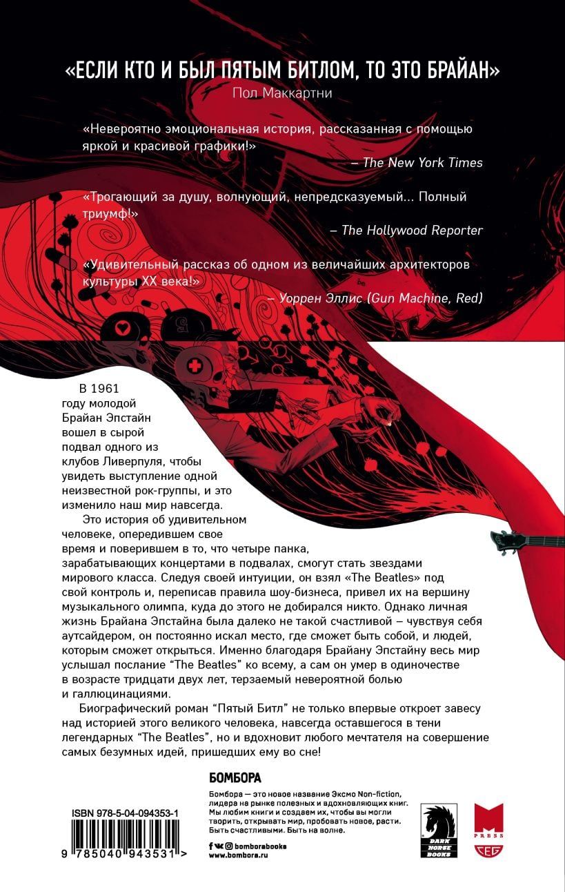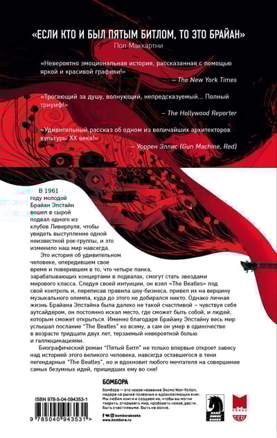 Брайан Эпстайн, «пятый битл» и менеджер группы, благодаря которому мир узнал о ливерпульской четверке, до сих пор остается неизвестным героем в невероятной истории покорения группой музыкального Олимпа. Бестселлер Нью-Йорк Таймс впервые раскрывает секреты этого загадочного гения в увлекательном графическом романе, основанном на автобиографии самого Эпстайна. «The Beatles» – группа, расколовшая мировую культуру на «до» и «после», а имена Джона Леннона, Ринго Старра, Пола Маккартни и Джорджа Харрисона давно вошли в историю. Но одно имя осталось в тени невероятного успеха ливерпульской четверки: имя человека, благодаря которому Битлз получили свой первый контракт со звуковым лейблом, попали на экраны телевизоров, прорвались на вершины хит-парадов и стали гастролировать по всему миру. Брайан Эпстайн, не имевший никакого опыта в музыкальном бизнесе, на концерте начинающих музыкантов в маленьком полуподвальном клубе Ливерпуля оказался совершенно случайно. Но именно с этой знаковой случайности по-настоящему началась история легендарного успеха «The Beatles». Брайан, долгие годы державший руку на пульсе группы, угас значительно раньше ее славы – в 32 года, практически сразу после прекращения гастролей в 1967 году. Три года спустя, в интервью Rolling Stone, Джон Леннон назвал этот момент «началом конца». Брайан Эпстайн так и не был посвящен в рыцари Британской Империи, а включение его имени в Зал Славы рок-н-ролла состоялось лишь в 2014 году, спустя полвека после его гибели. О том, как группа обивала пороги звукозаписывающих компаний и мирилась с неудачами, искала музыкальный и внешний стили, меняла состав и шагала на пути к славе под чутким руководством Брайана Эпстайна - в графическом романе «Пятый Битл».