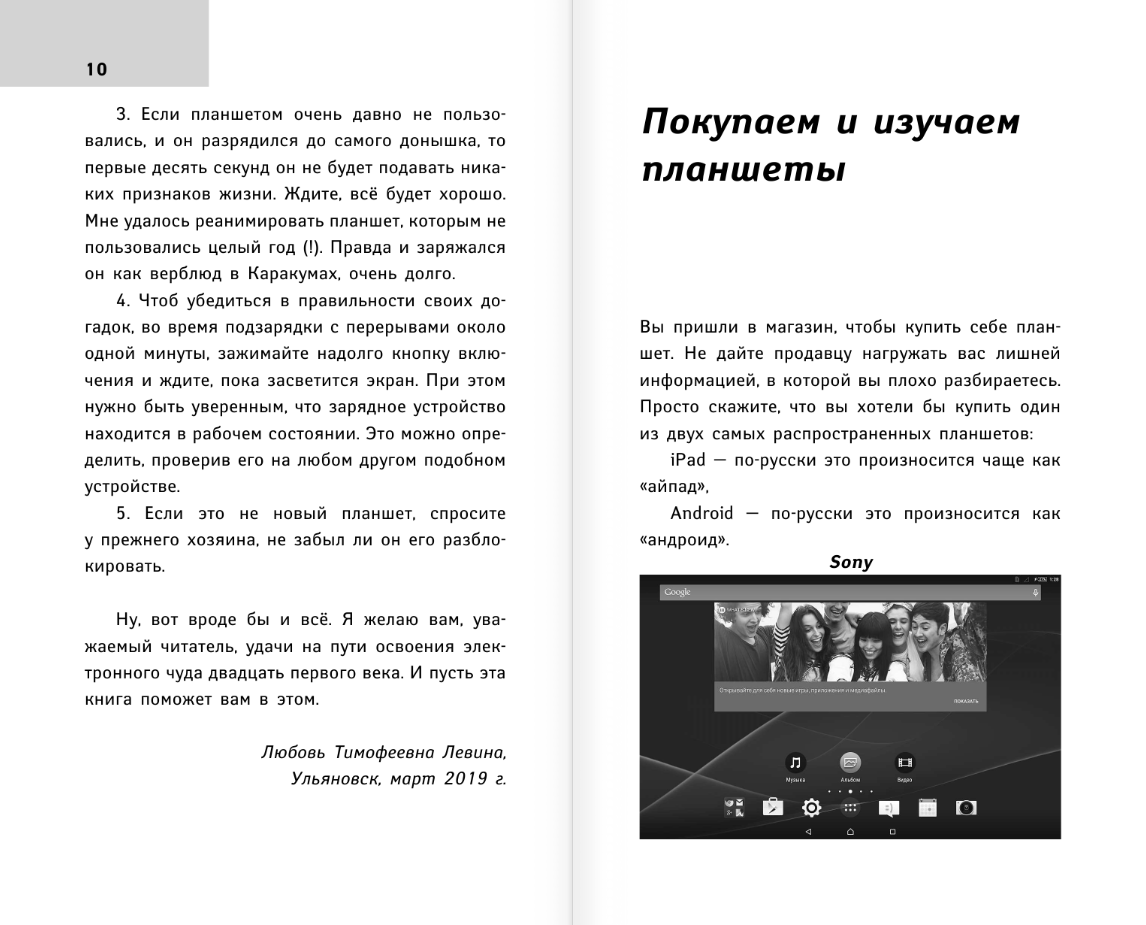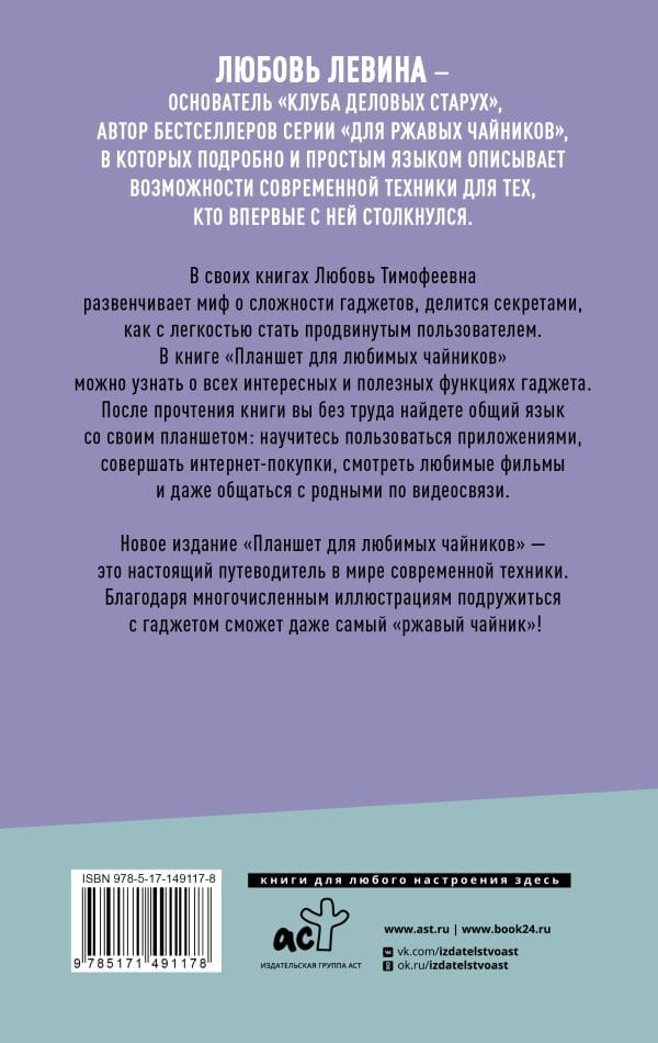 В своих книгах Любовь Тимофеевна развенчивает миф о сложности гаджетов, делится секретами, как с легкостью стать продвинутым пользователем. В книге «‎Планшет для любимых чайников»‎ можно узнать о всех интересных и полезных функциях гаджета. После прочтения книги вы без труда найдете общий язык со своим планшетом: научитесь пользоваться приложениями, совершать интернет-покупки, смотреть любимые фильмы и даже общаться с родными по видеосвязи. Новое издание «‎Планшет для любимых чайников»‎ — это настоящий путеводитель в мире современной техники. Благодаря многочисленным иллюстрациям подружиться с гаджетом сможет даже самый «‎ржавый чайник»‎.