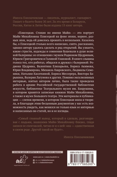 «Плисецкая. Стихия по имени Майя» — это портрет Майи Михайловны Плисецкой на фоне эпохи, вернее, разных эпох, ведь ей довелось прожить в нескольких. Казалось бы, о Плисецкой столько всего написано, снято, рассказано, однако автору удалось сделать и ряд открытий. Вы узнаете, какие страсти, надежды и сомнения бушевали в душе великой балерины: ее отношения с мужем Родионом Щедриным, Юрием Григоровичем и Галиной Улановой. В книге слышны голоса тех, кто работал, общался и дружил с балериной: Родиона Щедрина, Валентина Елизарьева, Бориса Акимова, Юрия Владимирова, Михаила Лавровского, Людмилы Семеняки, Наталии Касаткиной, Бориса Мессерера, Виктора Барыкина, Валерия Лагунова и других. Помимо эксклюзивных интервью, взятых автором лично, была также проведена работа в архиве Российской государственной библиотеки искусств, библиотеке Театрального музея им. Бахрушина, в котором хранятся записные книжки Майи Михайловны, а также в музее Большого театра. Эти материалы и публикации — слепок времени, в котором Плисецкая жила и творила, и благодаря этим бесценным документам у нас есть возможность увидеть, как менялся не только язык ее интервью и написанных ею статей, но и ее взгляды.