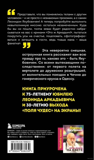 Прочитав его во многом автобиографическую книгу, вы узнаете, что Леонид Аркадьевич — мастер попадать в нелепые ситуации и также мастер с блеском из них выпутываться. А еще что он прекрасный рассказчик и обладает потрясающим чувством юмора и прекрасно владеет словом. В это обновленное издание вошли новые рассказы Леонида Аркадьевича, которые расскажут вам всю правду про то, каково это — быть Якубовичем. Расскажет так легко и непосредственно, будто вы услышали все эти истории, попивая чай на одной кухне с ее автором. Первый полет на вертолете и назойливые журналисты, поездки в Чечню, дружеские розыгрыши с Геннадием Хазановым, все удачные и совсем не удачные попытки найти свой путь — чего только ни случалось в жизни этого всенародно обожаемого ведущего, талантливого актера и прекрасного человека.