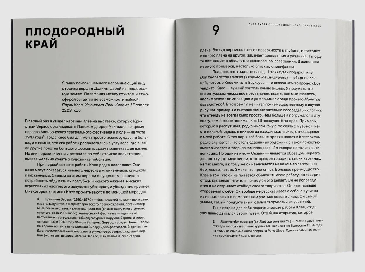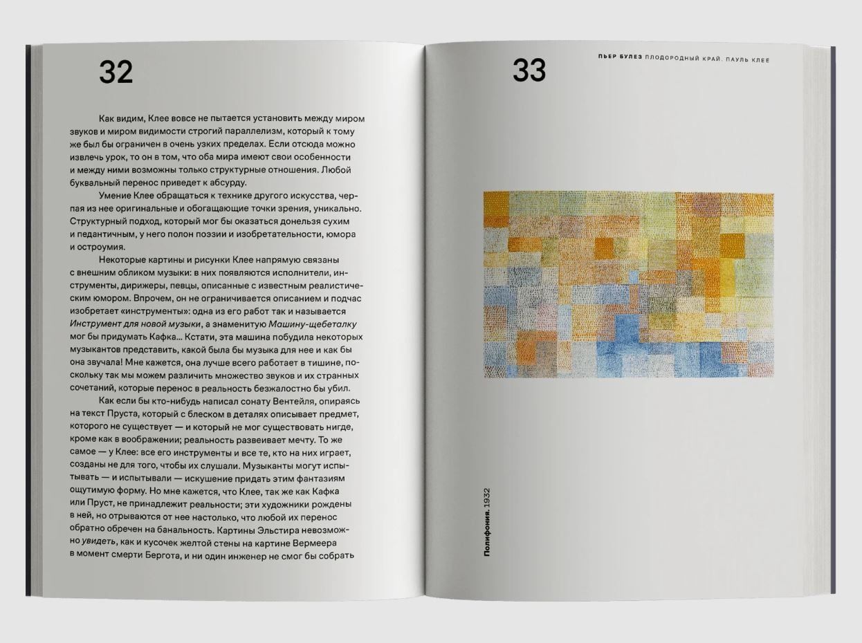 «Плодородный край» — таинственная страна, запечатленная на нескольких картинах Пауля Клее, и одноименное эссе французского композитора и дирижера Пьера Булеза, посвященное взаимовлиянию музыки и изобразительного искусства в теоретических трудах и художественной практике гения европейского авангарда. Выросший в семье скрипача и певицы, Клее превосходно ориентировался в классических музыкальных формах и использовал их при решении чисто живописных проблем. Нередко в своих полуабстрактных композициях он обращается к нотописи, рисует фигуры дирижеров, певцов, несуществующие инструменты, а в лекциях и названиях произведений прибегает к музыкальной терминологии, — так временной отрезок фуги у него становится пространством картины. Булез, в свою очередь, находит в искусстве и теории Клее опору для изучения структуры и ритма в музыке. Этот непрерывный обмен, переход между музыкой, живописью и литературой, а также теоретической строгостью и экспрессивным вдохновением становится, по мысли Булеза, плодородным краем любого творчества.