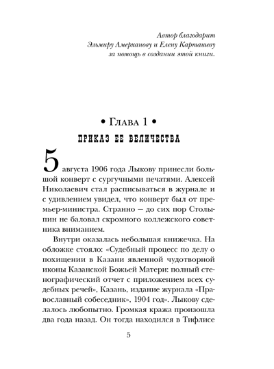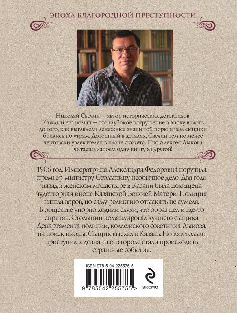 1906 год. Императрица Александра Федоровна поручила премьер-министру Столыпину необычное дело. Два года назад в женском монастыре в Казани была похищена чудотворная икона Казанской Божией Матери. Полиция нашла воров, но саму реликвию отыскать не сумела. В обществе упорно ходили слухи, что образ цел и где-то спрятан. Столыпин командировал лучшего сыщика Департамента полиции, коллежского советника Лыкова, на поиск иконы. Сыщик выехал в Казань. Но как только приступил к дознанию, в городе стали происходить страшные события.